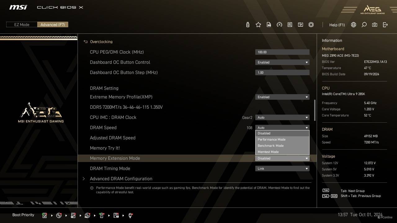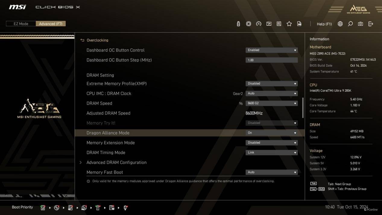 内存方面除了有熟悉的XMP、Memory Try it以及Memory Extension Mode外,还新增了一个全新的“Dragon Alliance Partner”功能,微星对内存超频进行了深入研究,通过专注于1 SPC设计、存储器IC开发、PCB增强布局以及专用BIOS功能优化实现更高的内存频率,它的作用是当你使用的内存与微星有合作时,那你将获得更高的性能释放。例如我们本次测试使用的,它能够冲击8600MHz的超高频率,稳定运行各项任务。