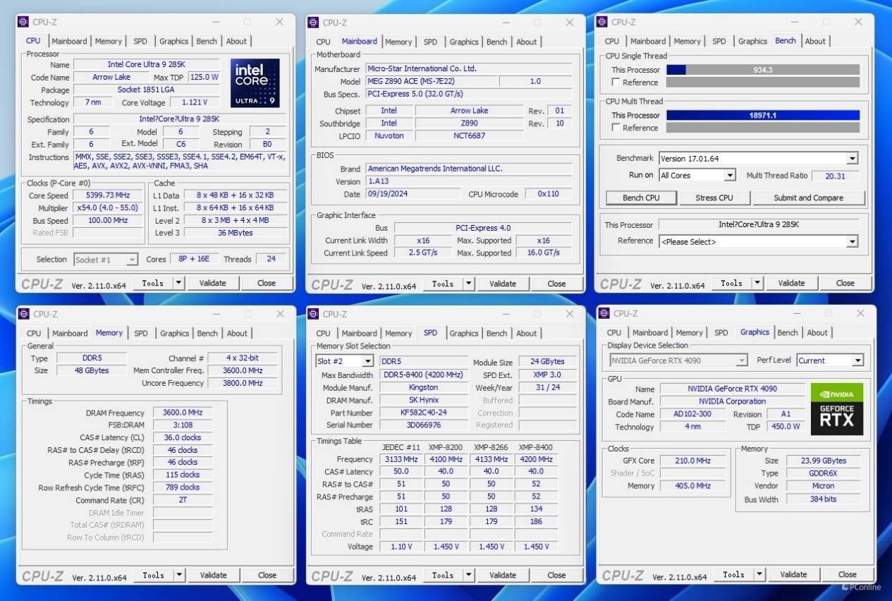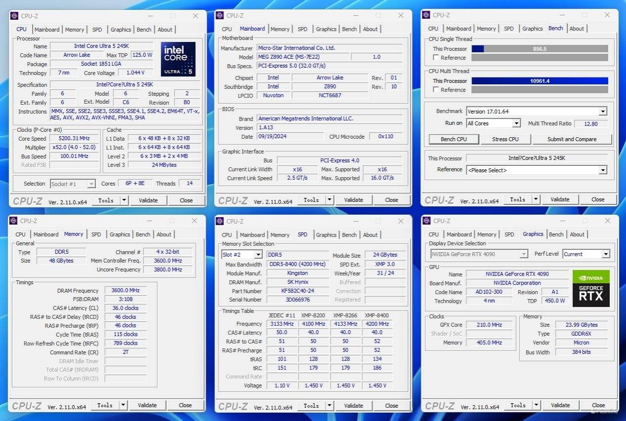 通过CPU-Z软件对平台硬件进行查看,可以看到平台CPU处理器部分使用的分别是24核24线程的酷睿Ultra 9 285K处理器以及14核14线程的酷睿Ultra 5 245K处理器。