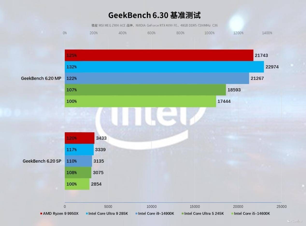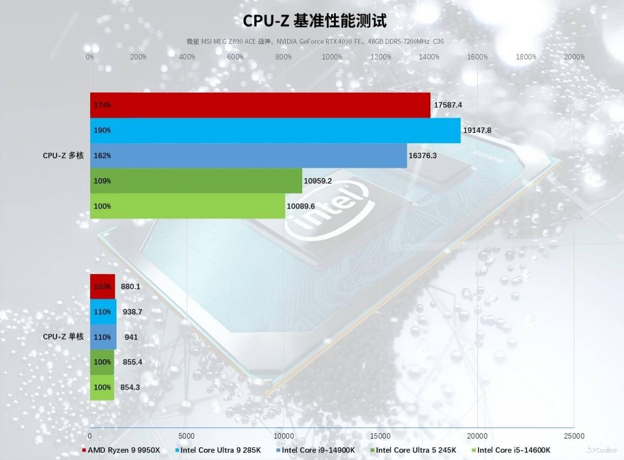 为了方便对比,我们也对前代的两颗同系处理器进行了测试,实测新的英特尔酷睿Ultra 5 245K处理器的表现还是相当惊艳的,多核成绩相比上代处理器,提升了约10%。而旗舰级的酷睿Ultra 9 285K就更顶了,单核成绩超越了竞品7%,而多核成绩则以19147.8分傲视群雄,这个成绩对比i9-14900K的话,性能领先28%,如果对比9950X,性能领先也有16%,表现还是相当惊艳的。