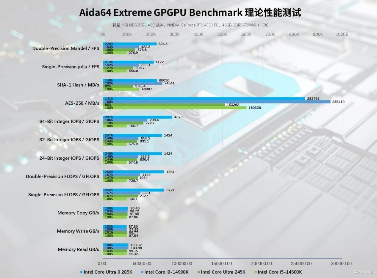 从实测数据来看,新款的两颗CPU处理器性能领先颇多,特别是在单精度、双精度方面,其中“Single-Precision Julia”(SPJ)是对于大型游戏运行的重要衡量参数,而“Double-Precision Mandel”(DPM)则对流体力学,Matlab这类科学运算速度是重要衡量指标。实测两款处理器在这方面的表现堪称爆杀,酷睿Ultra 9 285K的表现比上代强了约50%以上,而酷睿Ultra 5 245K也不弱,基本也有25%的领先优势。
