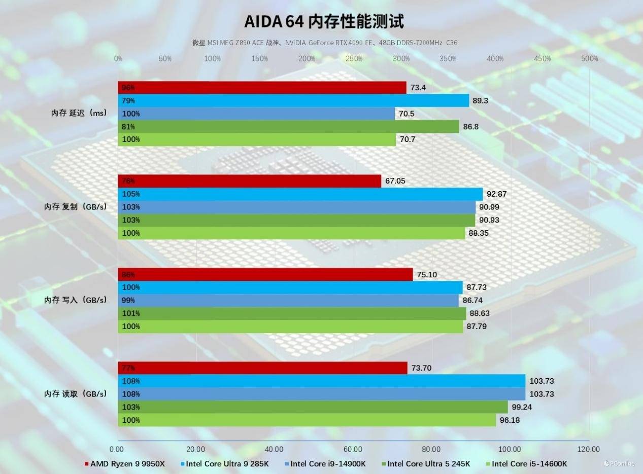 跟着我们再测试一下内存性能,从成绩上看,现在的高频内存在这代酷睿Ultra 200S的面前完全不是问题,除了能够支持更高内存带宽外,还能拥有更低的内存延迟,对比竞品9950X那绝对是断层式的领先。