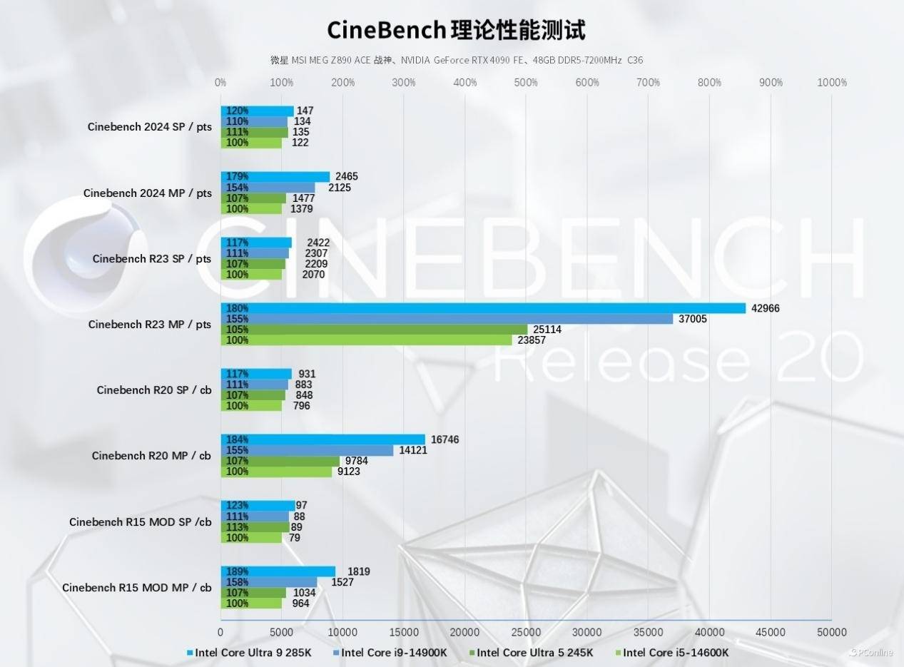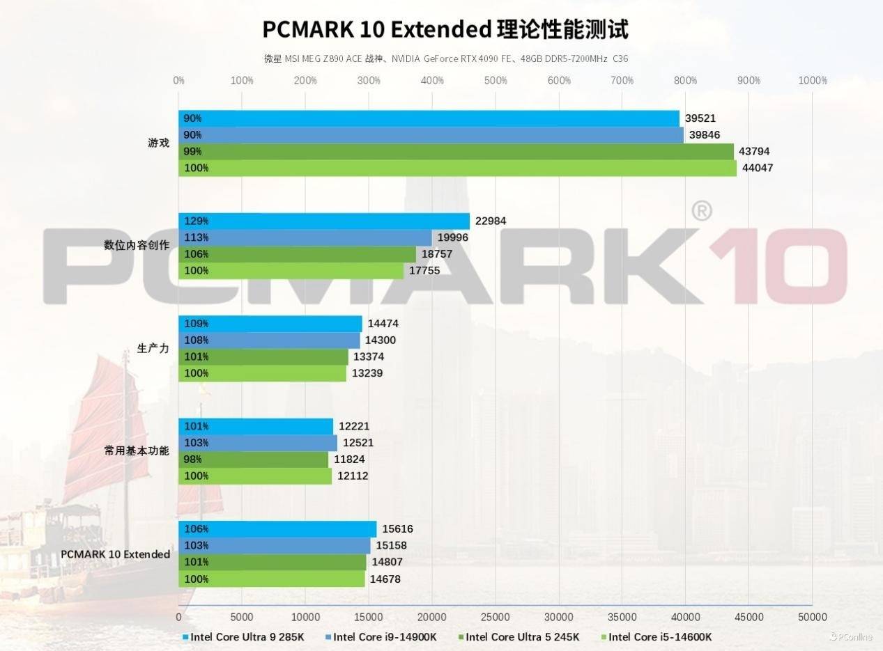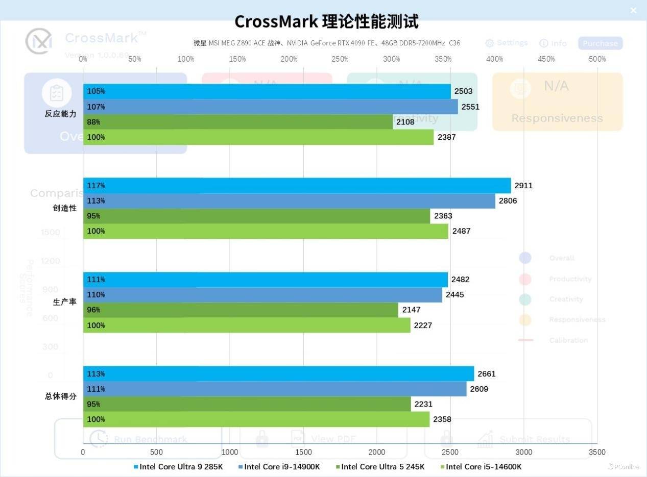 在这里,酷睿Ultra 9 285K与酷睿Ultra 5 245K的表现还是不错的,整体性能方面,旗舰级的酷睿Ultra 9 285K相比i9-14900K要领先约3%以上,特别是在创造性以及生产率两个方面,这与上面创作生产力测试的结果类似,因此设计师们换上新处理器确实能够实现更高效的工作效率。