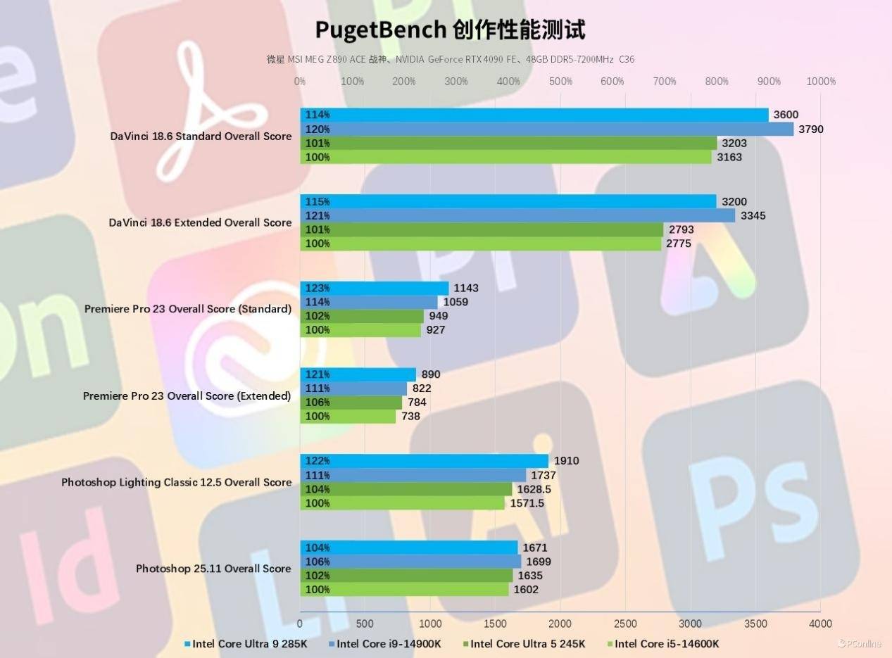 实测结果如上,有一说一,这一代的处理器在创作生产力方面还是有提升的,其中Photoshop、Premiere是提升比较大的几项。例如,在比较吃单核性能的PS中,酷睿Ultra 5 245K相比前代产品提升了约2%,Premiere则是领先6%左右,而24核24线程的酷睿Ultra 9 285K则最大能领先到10%。