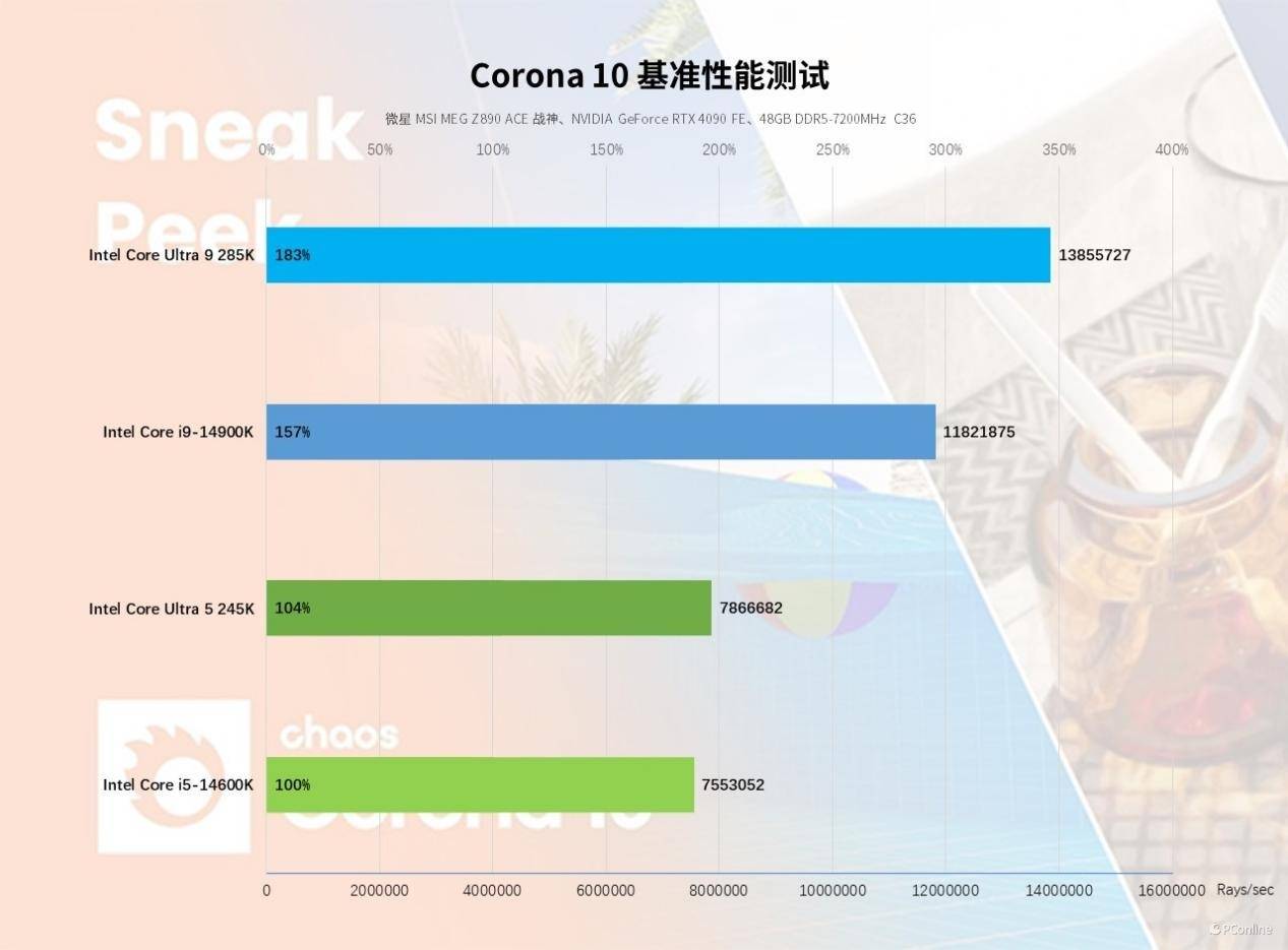 我们再来测一下这个渲染界的后起之秀——Corona,在渲染质量和速度上其实非常优秀,可以直接类比的对象就是Vray。他可以在3Dsmax 和C4D等软件中渲染使用,代表性很强,效率也还不错。实测酷睿Ultra 5 245K的表现相比i5-14600K提升了4%左右,而酷睿Ultra 9 285K则对比同级提升了28%,渲染速度达到13855727 Rays/sec,也就是每秒钟可以渲染1385万5000条光线数量,表现还是相当可观的。