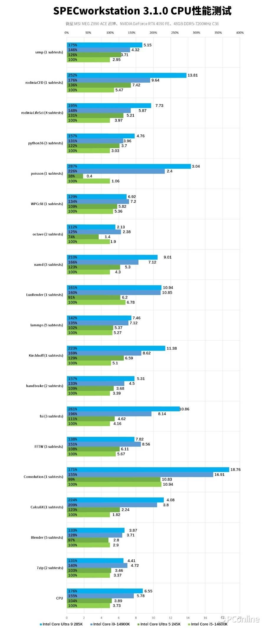 最后是SPECworkstation,这程序是针对生产力工作站电脑的测试工具,也就是所谓的工业领域。相比14代酷睿,新的酷睿Ultra 200S系列在SPECworkstation中的整体性能表现依旧强势,综合来看,酷睿Ultra 9 285K得益于更先进的微架构设计,在SPECworkstation中的性能表现总体要比前代的i9-13900K要强6%左右,而酷睿Ultra 5 245K也不错,基本能够做到3%的性能提升。加上目前这两款处理器的定价都比上代首发时要低不少,性价比确实真香。