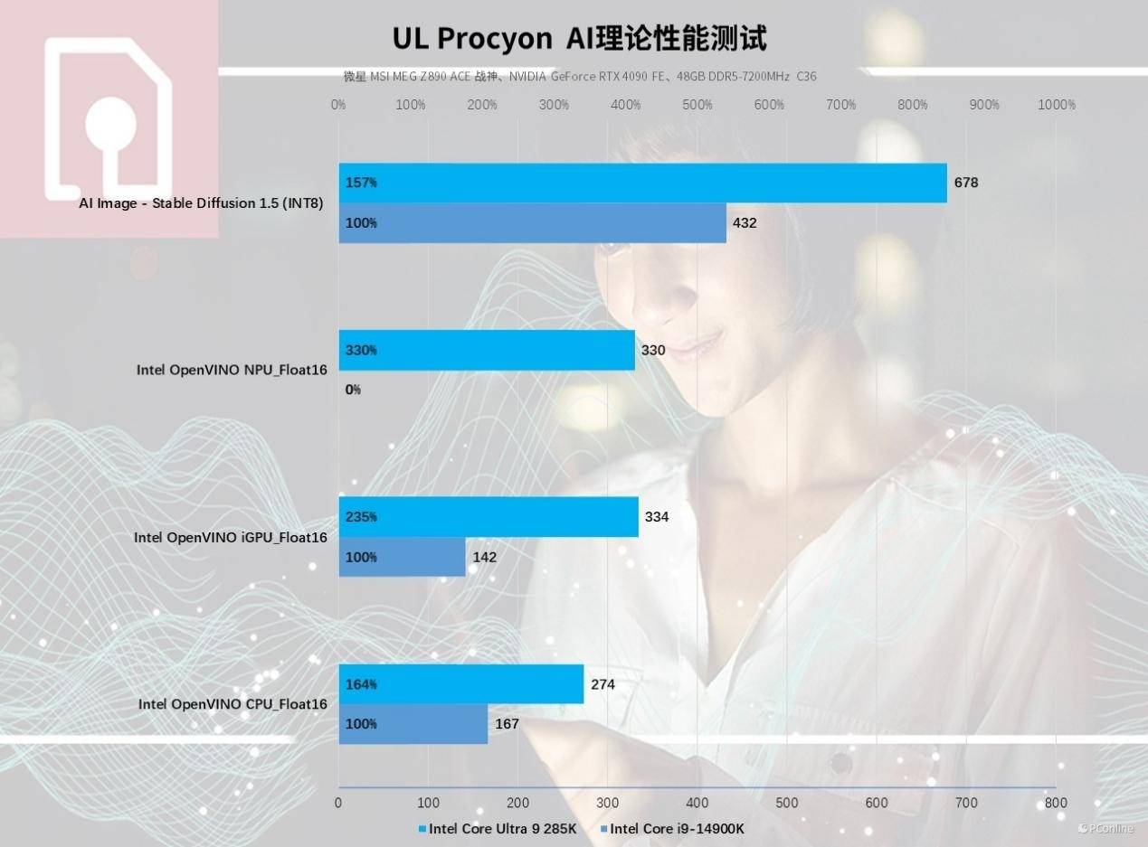 首先来点简单的,就用UL Procyon的Intel OpenVINO以及Stable Diffusion1.5进行测试,我们分别测试了i9-14900K以及酷睿Ultra 9 285K。实测结果如下,首先是SD1.5的AI生图,换上新架构核显后,出图速度明显提升,成绩足足是上代UHD 770的1.5倍有多,再看看Intel OpenVINO测试,这项测试能够单独测试CPU、iGPU以及NPU的表现,实测新处理器也是全面领先,其中CPU性能提升64%以上,核显提升直接就是翻倍的表现,换算一下,强了得有135%!而NPU就是遥遥领先了,成绩甚至与新架构的核显不相上下。