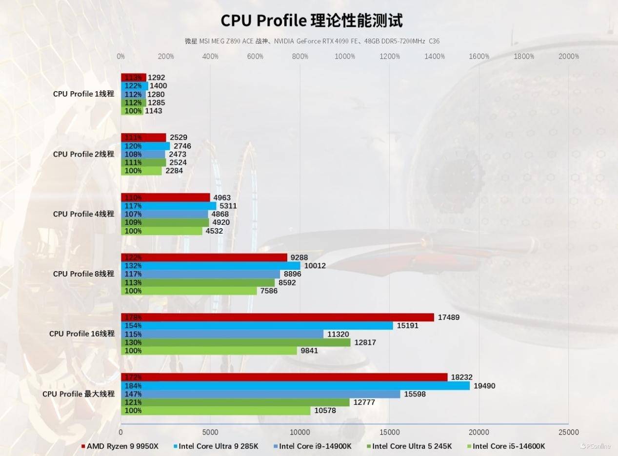 我们也测试了CPU Profile项目,看看实际应用中,这两颗全新的酷睿Ultra 200S系列处理器有何亮眼表现。测试中两颗处理器也是不负众望,二者相比前代产品,都能有10%以上的性能领先。最大线程方面,酷睿Ultra 9 285K能够跑到19490分,相比i9-14900K多了约4000分,虽然砍了超线程,但性能依旧超越了37%以上。