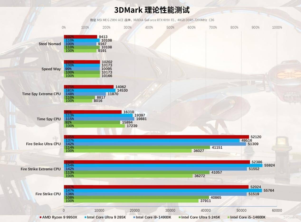 而在以DX12为代表的Time Spy系列测试中,Intel的两颗新款CPU一样出色,就拿压力更大的Time Spy Extreme来说,以i5-14600K为基准,那酷睿Ultra 5 245K与酷睿Ultra 9 285K能够分别领先10%与81%,相当强势。
