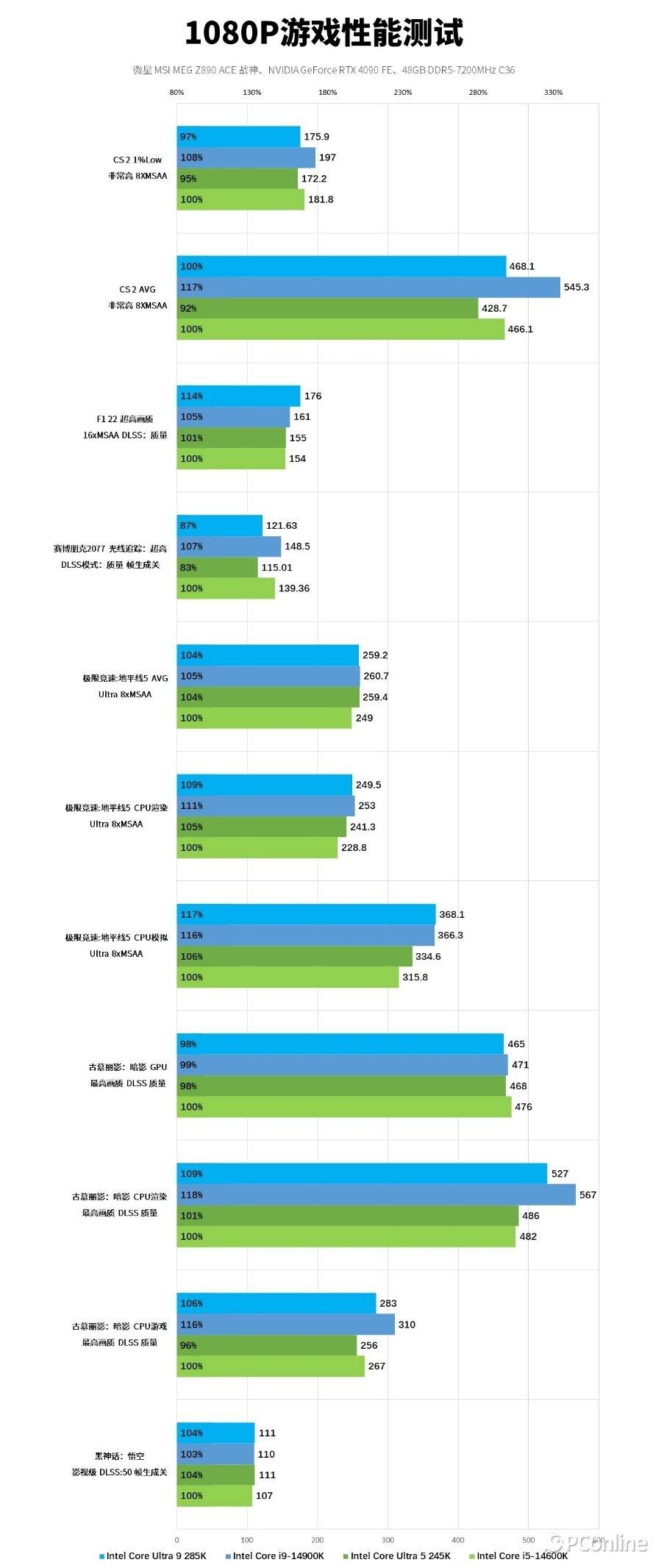 接下来就是大家关注的游戏实测环节了,为了能够更好地挖掘两款新CPU的性能,我们采用1080P分辨率进行测试。游戏方面由于时间比较紧张,所以我们只选取了一些自带Benchamark测试程序的游戏进行性能测试。而为了避免处理器瓶颈,于是显卡采用的是顶级的RTX 4090 FE。