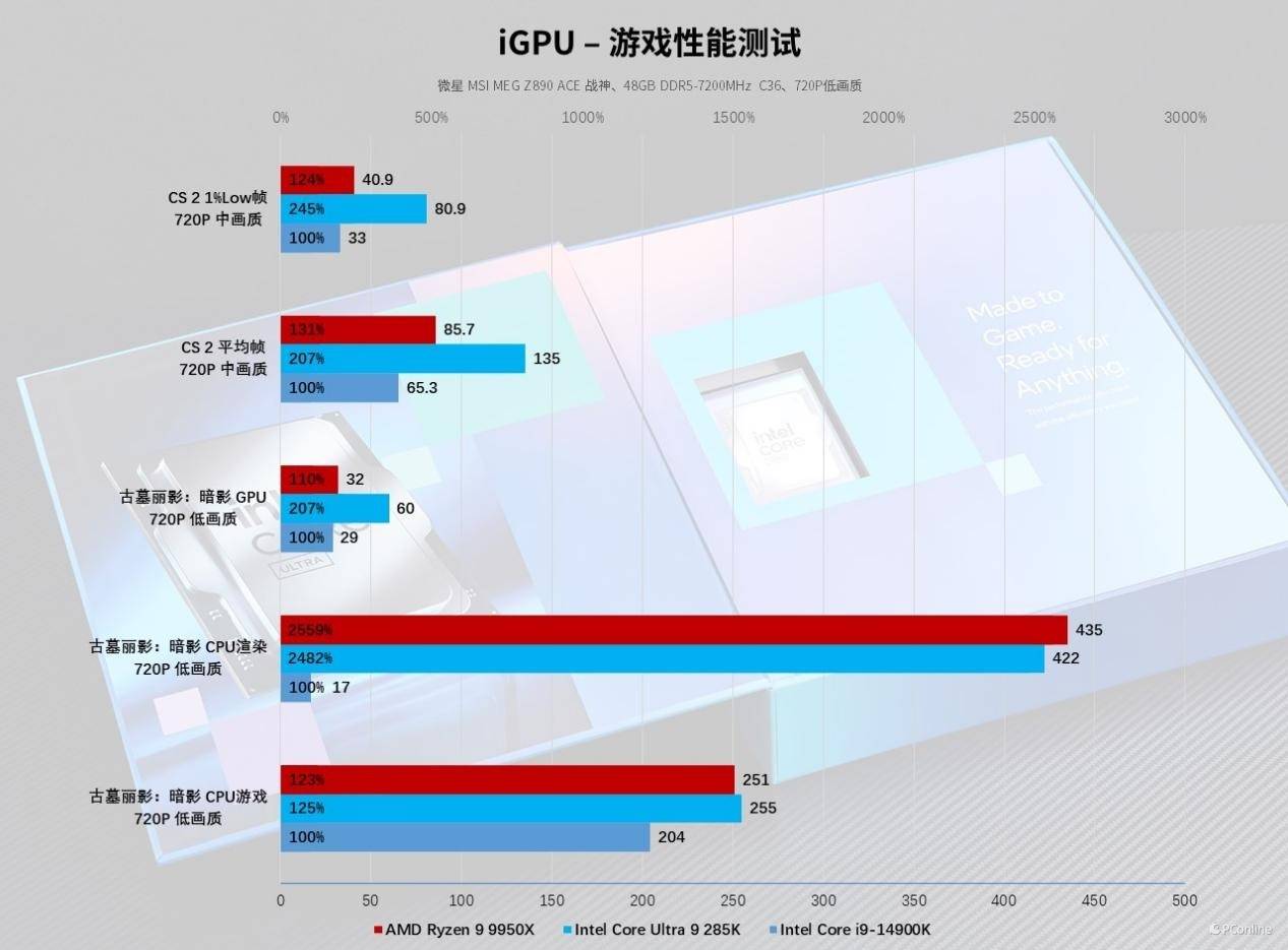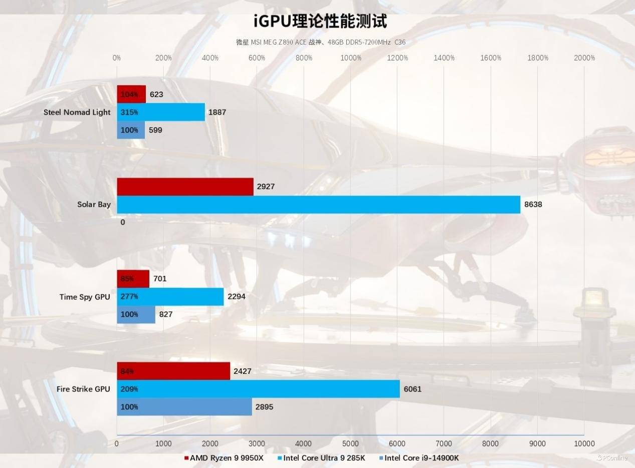 上面的介绍中也提到这代处理器在核显方面也有改进,所以我们也很好奇酷睿Ultra 200S上这个与ARC A770同架构的核显表现究竟如何,因此我们也拉来了上代处理器的UHD 770以及9950X上2CU的Radeon 610M进行对比。
