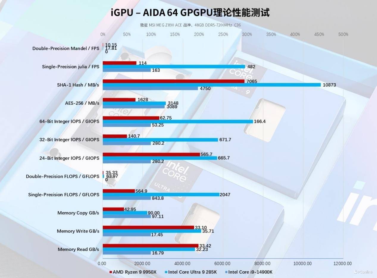 在AIDA 64的GPGPU测试里,这颗核显同样一骑绝尘。特别是在单精度方面,对比其他两款核显,酷睿Ultra 200S上的Xe核显几乎是2倍甚至3倍的提升。除此之外,在64位、32位、24位整数运算里,新升级的核显更夸张,部分项目里,领先甚至可以到4倍以上。