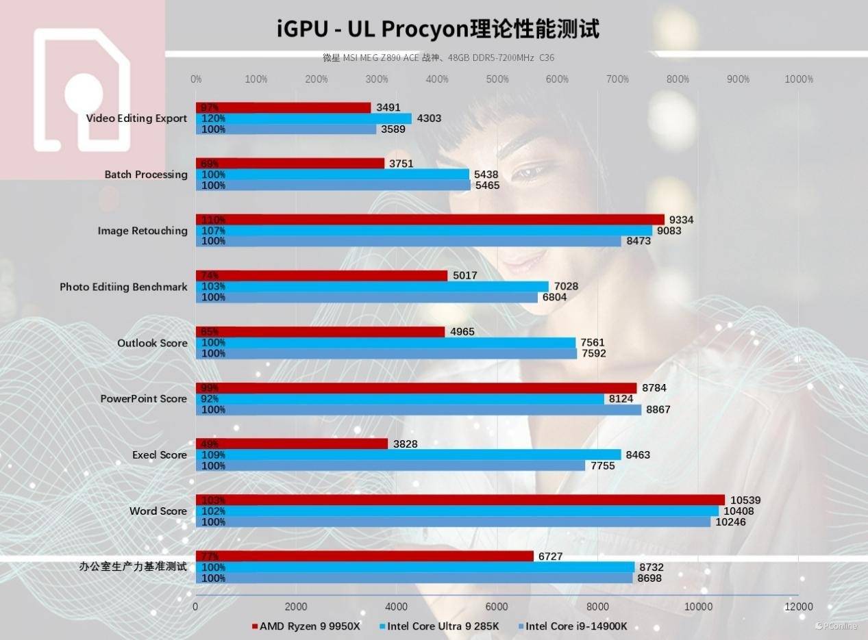 理论性能方面的提升确实巨大,实际应用层面又如何?老样子,先看创作方面的表现,还是UL Procyon的办公以及图像视频测试,实测Office办公软件里,核显的性能加持不大,而在图像编辑、视频剪辑领域这种压力比较大的测试中,核显的能力才能真正展现。特别是在LR、PR这种有特殊优化的软件中,英特尔的核显明显优于,而酷睿Ultra 200S上的Xe核显凭借更高的规格以及更新的架构,再度领先UHD 770约3%~20%。