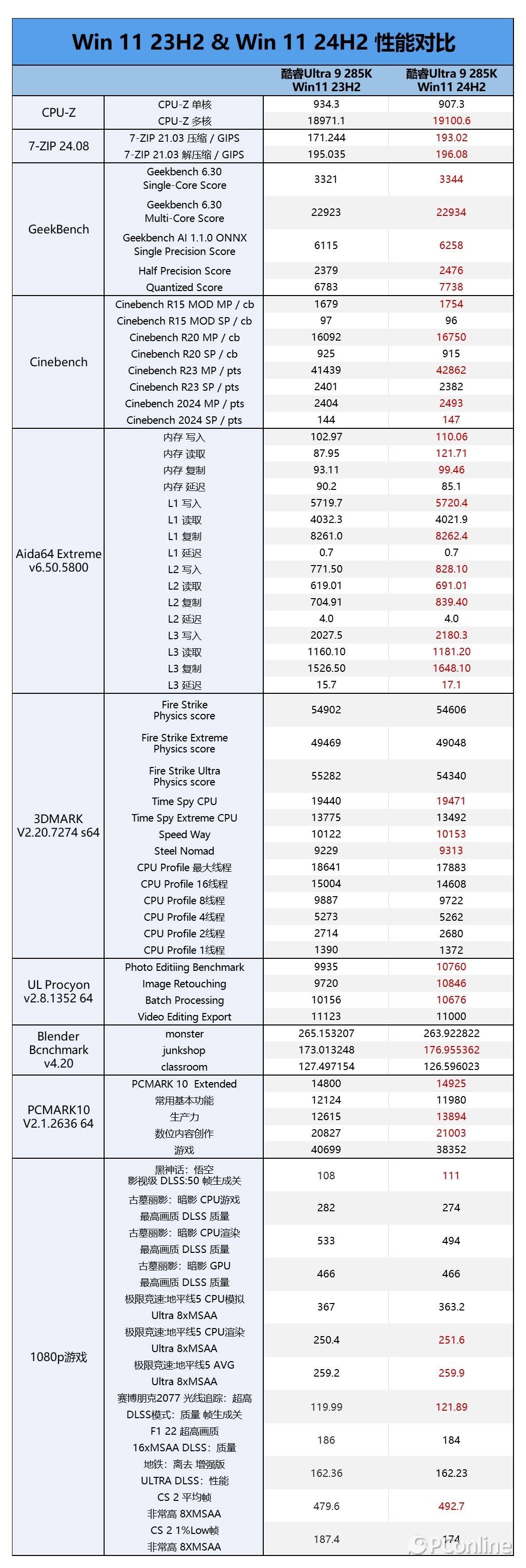 最近一段时间,硬件圈一直在传Windows 11 24H2可明显提高性能表现,针对AMD来说,情况确实属实,虽然实际提升幅度并没有官方宣传的那么大,但普遍还是多少有一些可感知的提升。那这个24H2对酷睿Ultra 200S系列有没有效果呢,我们分别用两个版本的系统对酷睿Ultra 9 285K进行了实测,结果如下: