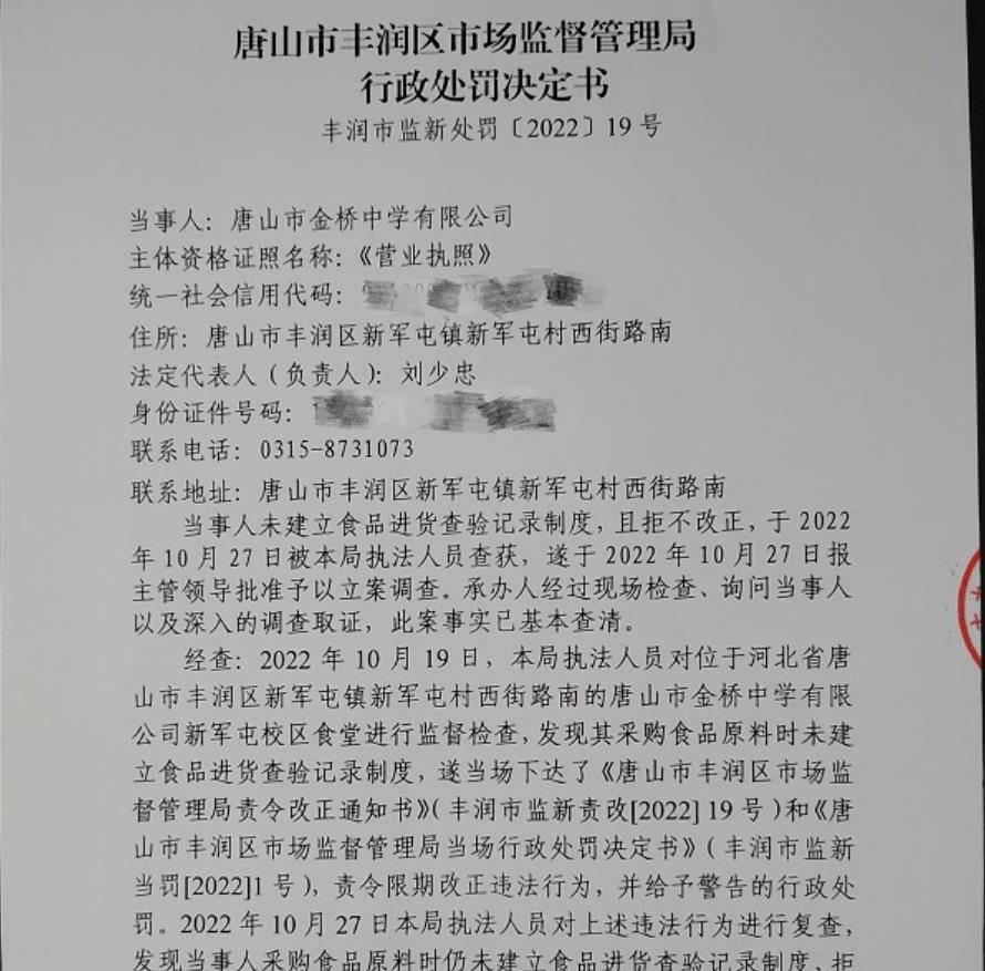 — 拒不改正违法行为!唐山市金桥中学被罚1.8万元 —