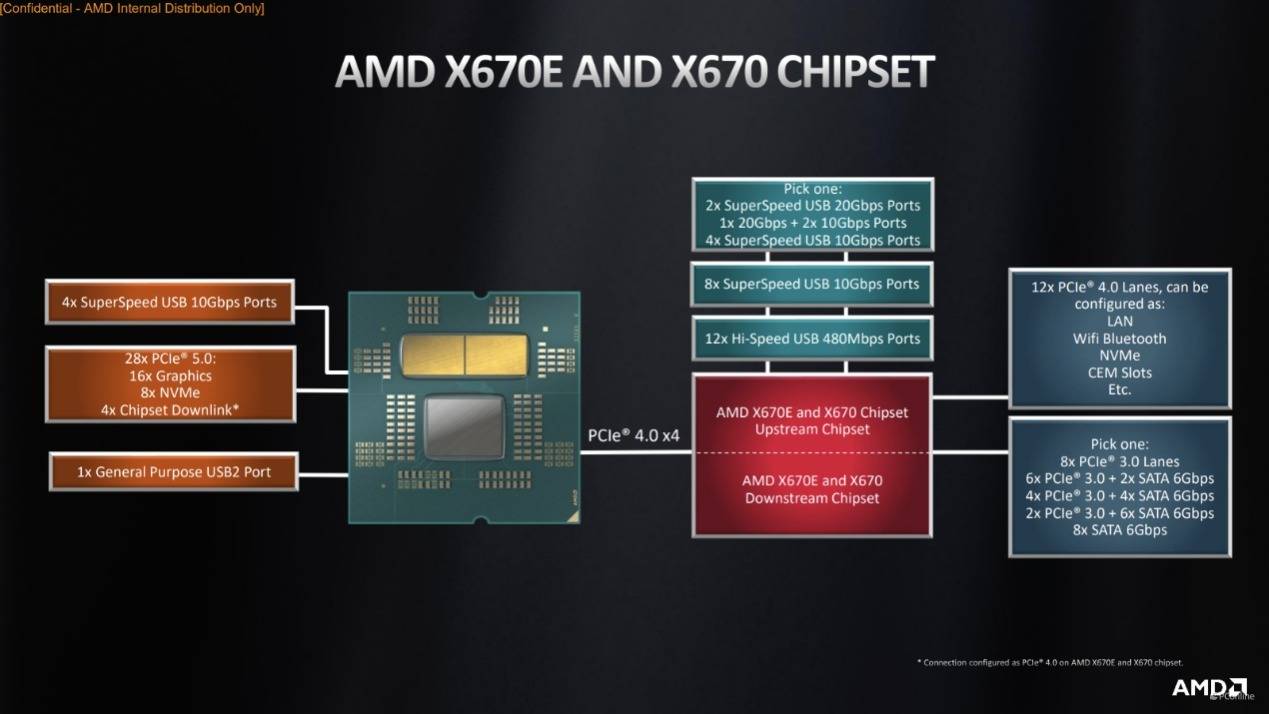 那么B650对比大哥X670和X670E差在哪里了呢?我们先来看看X670的规格图,这里与B650主板芯片组最大的差别在于使用了双芯片设计,能够提供额外的PCIe通道,相比B650,X670与X670E会多出4条PCIe 4.0和4条PCIe 3.0通道,扩展能力会更强。