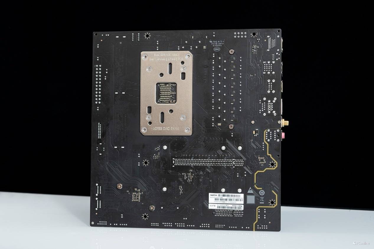这款主板的背面设计同样延续了正面的科幻电竞风格,通体采用深邃的黑色调,与正面的黑色涂装相呼应,形成了一种统一而协调的视觉效果。另外PCB背部的走线布局也非常整洁,尽显大厂做工风范。