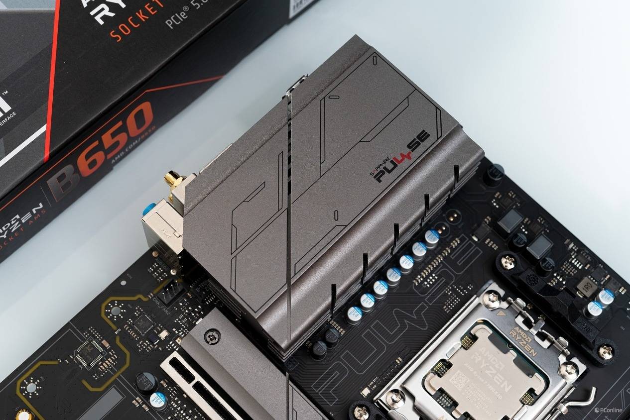 另外,主板的右下角还有一块小型的散热模组,设计与主板的金属灰色系保持一致。其下面压制的正是B650芯片组。