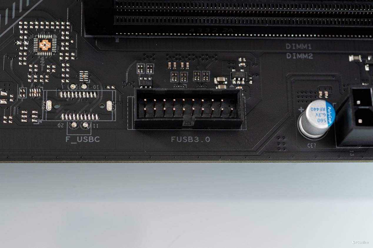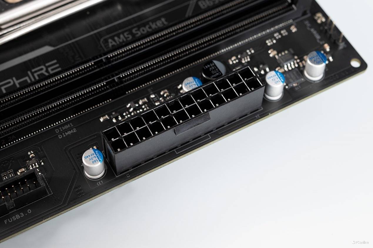除此之外,蓝宝石 Pulse 脉动 B650M WIFI主板的扩展性也相当丰富,主板24Pin供电的一侧是USB 3.0接针,可以扩展出2个USB 3.2 Gen 1 5Gbps(Type-A)接口,这个配置基本能够满足玩家的扩展需求。