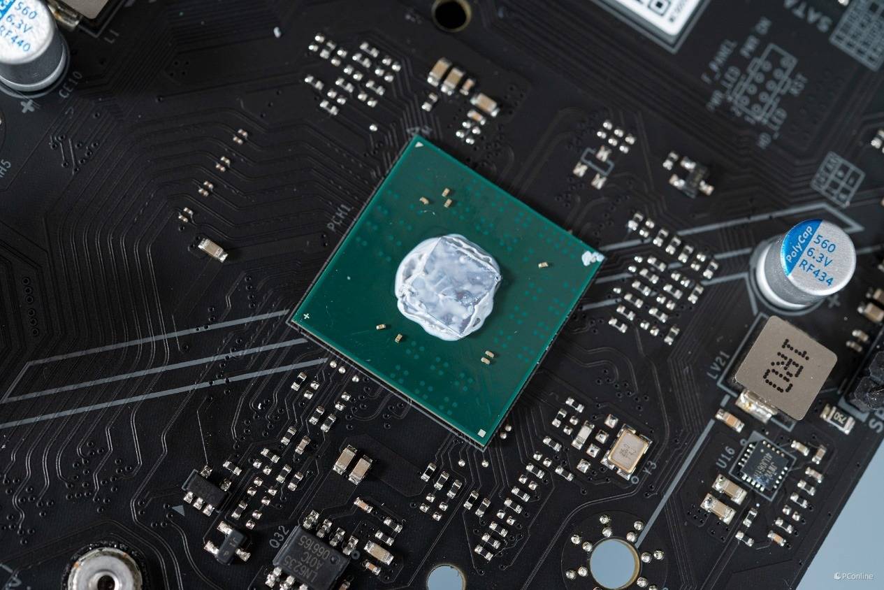 卸下以后就能看到B650芯片。其主要负责I/O接口等一些外设接口的控制及提供部分PCIe通道。在规格上虽然略输X670,但是对大多数玩家来说,B650的性能和配置都是够用的。