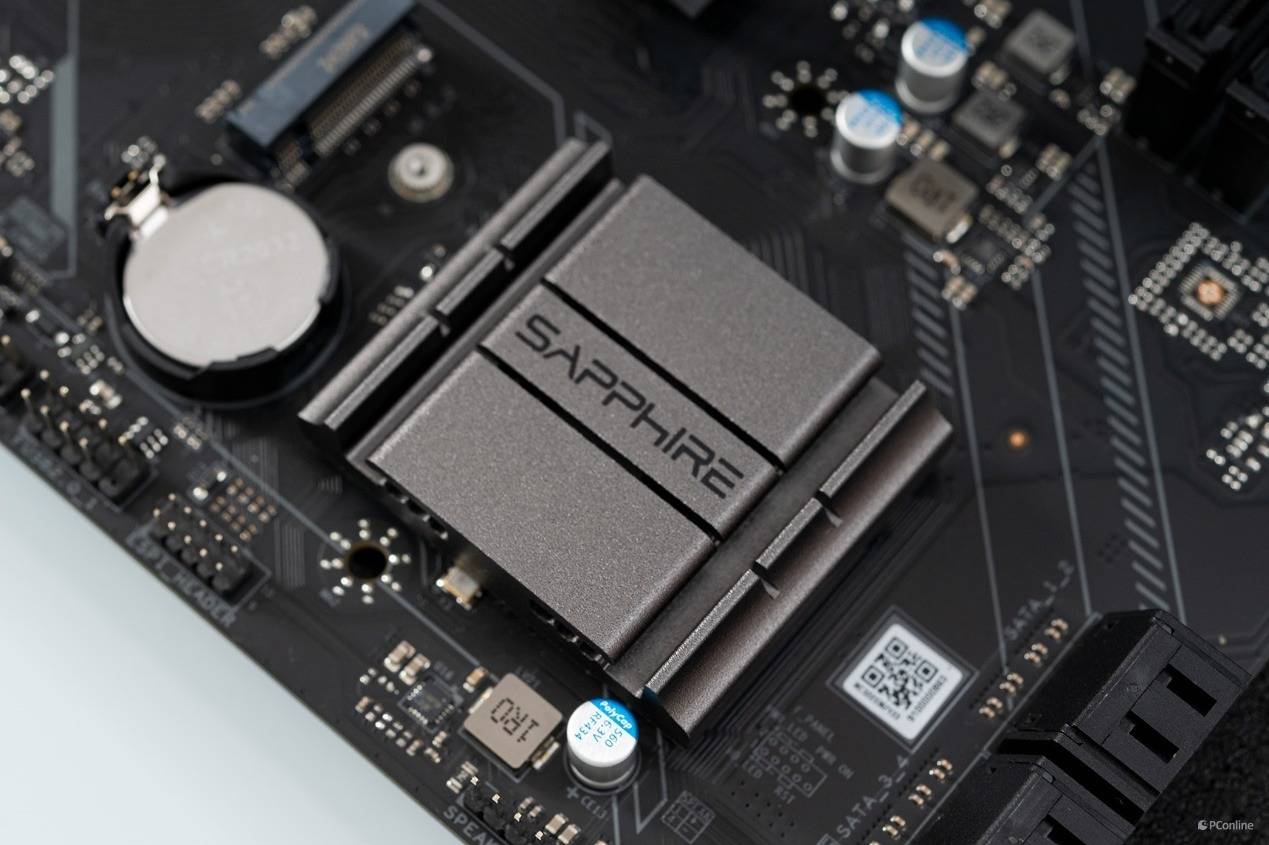 在PCIe插槽的两侧则是主板的M.2固态硬盘插槽,蓝宝石 Pulse 脉动 B650M WIFI主板直接配置拉满,顶部带马甲的为PCIe 5.0速率,一秒可以实现接近10G的读写速度,海量文件瞬间传完。