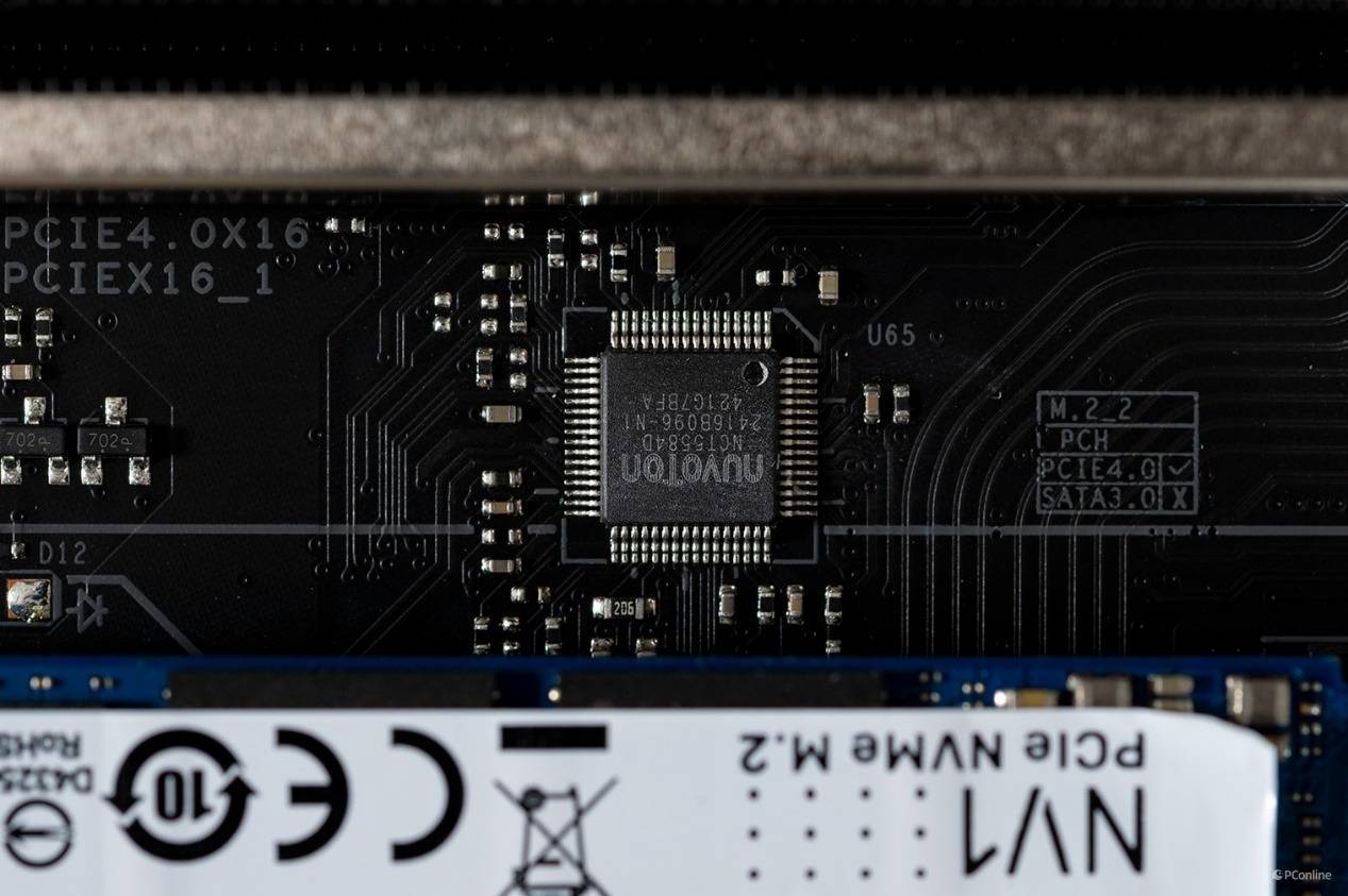 另外,在第一根PCIe插槽的下方有一颗来自NUVOTON新唐的芯片,型号是NCT5584D,这是一颗 Super IO 芯片,主要用于监控主板上各个硬件的温度、转速、电压等,监控的同时还提供了一些低速总线,比如 SPI。