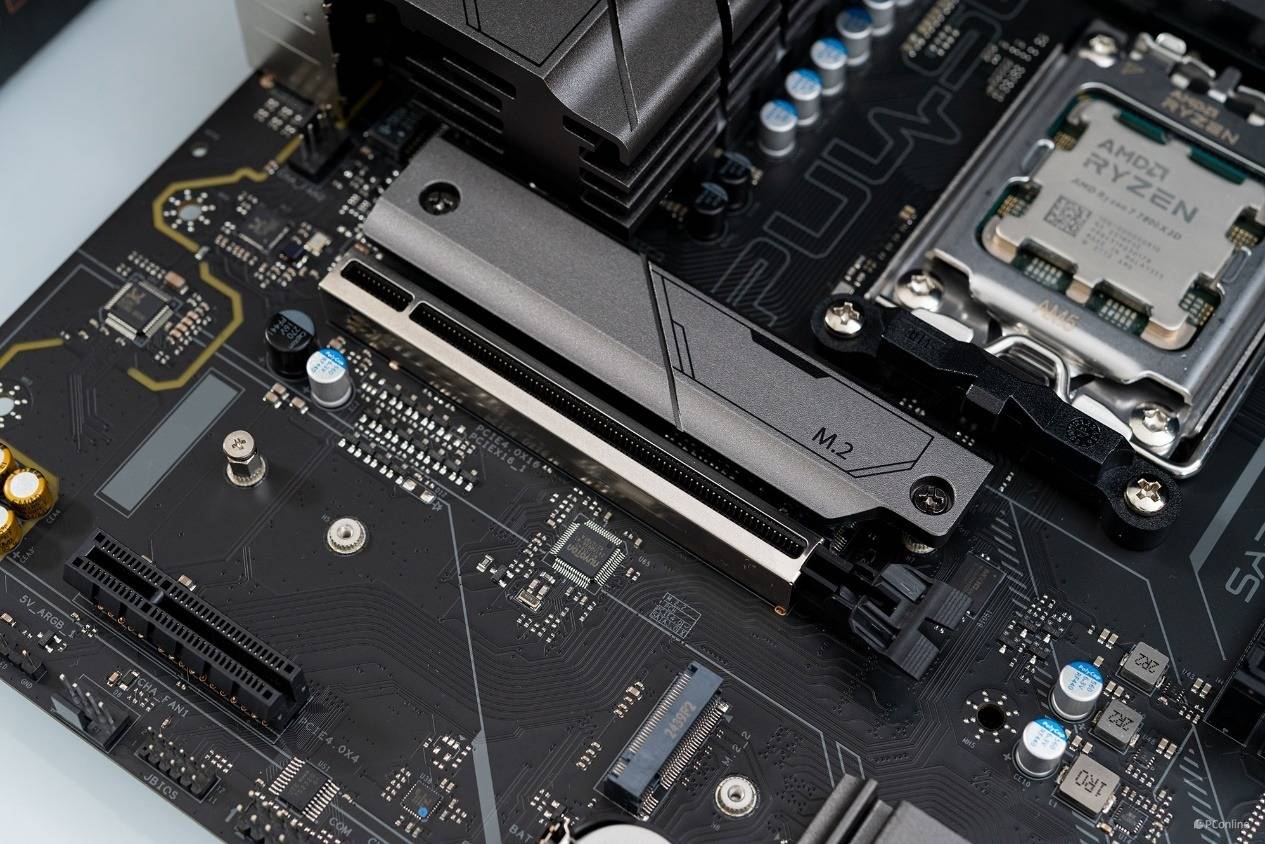 AM5接口的旁边就是这块主板的供电模组了,其表面由大面积的VRM散热模组覆盖,散热模组为金属灰配色,还有各种斜切线条进行装饰,电竞感十足。散热模组的背面还有高导热系数的硅胶片加持,有利于提升热量的传导效率,帮助主板提高散热效能。