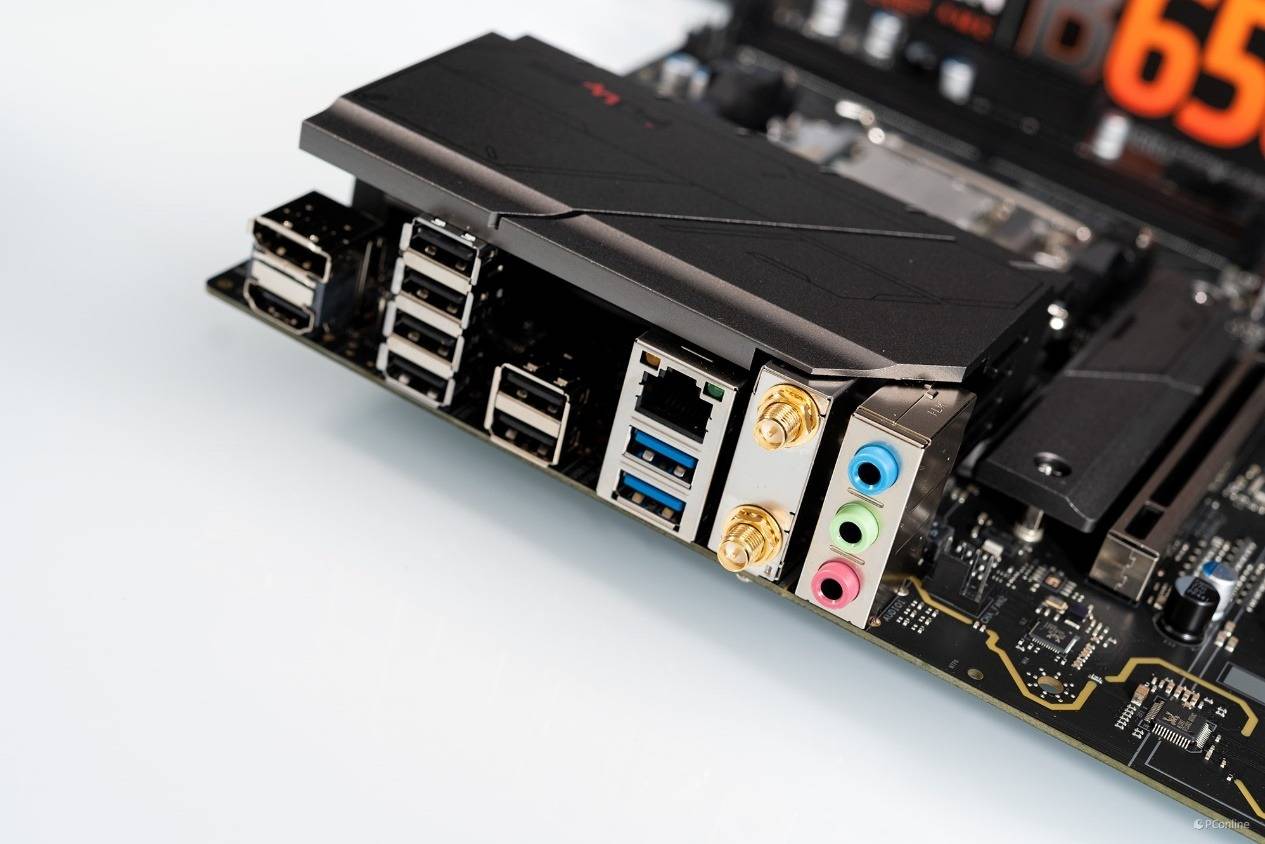 后置IO部分,这款主板也是应有尽有,从左到右分别是1个DP,1个HDMI,6个USB 2.0接口,2个USB 3.2接口、1个千兆LAN有线网口、Wi-Fi 6天线接口以及5.1声道音频接口。另外这款主板还可以选择不带Wi-Fi的版本,非常适合追求高性价比玩家。
