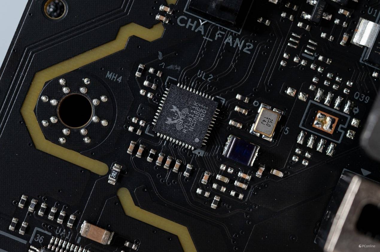 我们本次上手的是带Wi-Fi网卡的版本,因此这张主板预装了Wi-Fi 6芯片组,型号是AW-XB547NF,也就是瑞昱的RTL8852-BE无线网卡,支持WiFi-6,同时集成了蓝牙5.2。有线网络方面同样是来自瑞昱科技,为Realtek RTL8111K网卡,支持千兆有线网络。