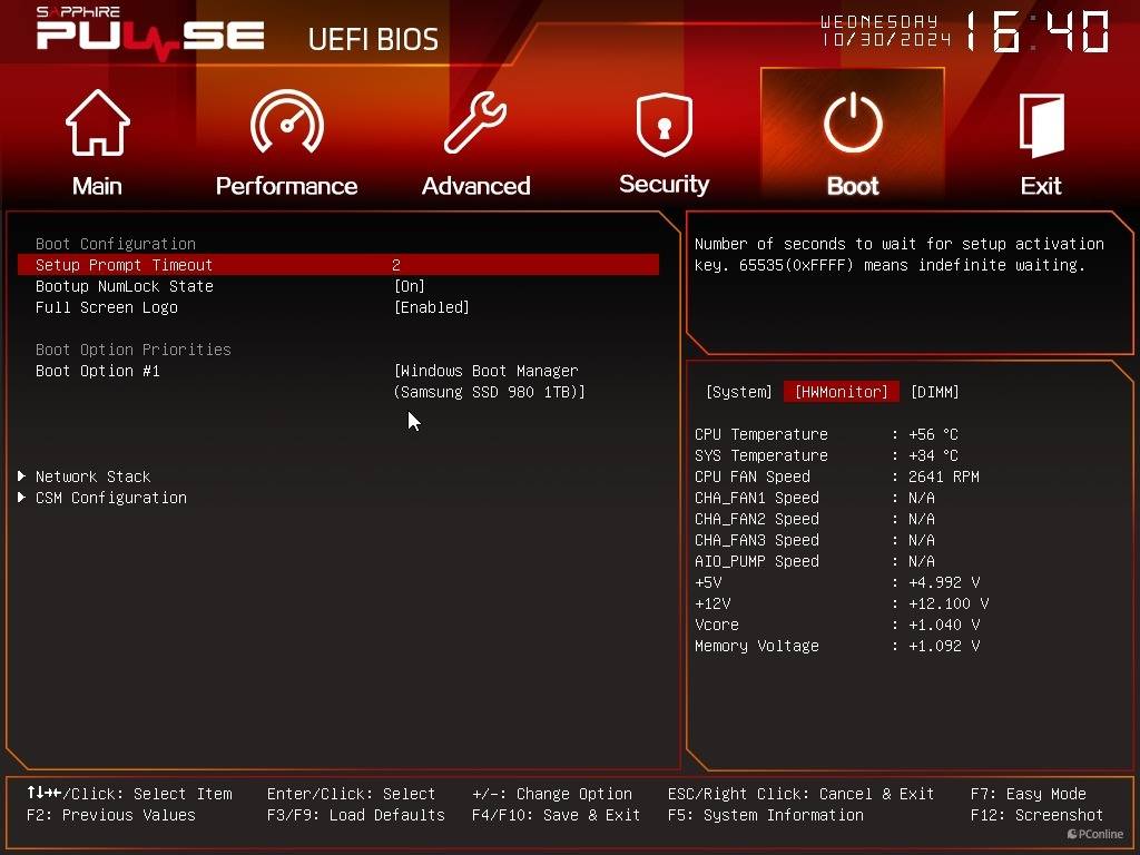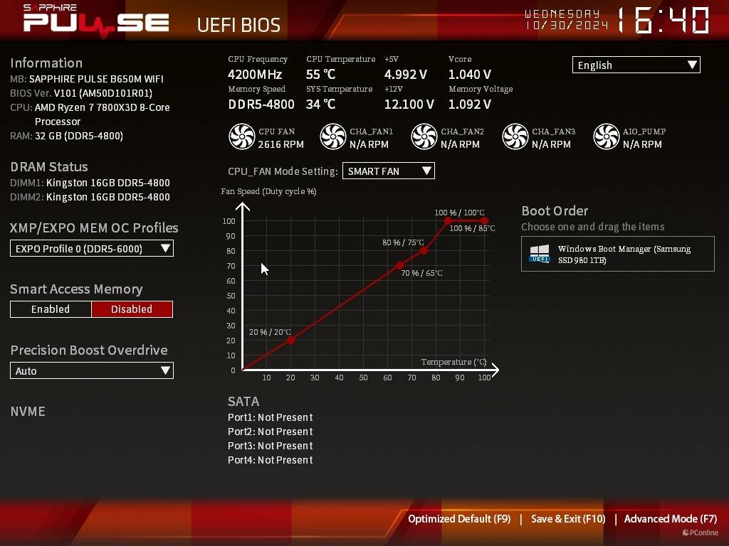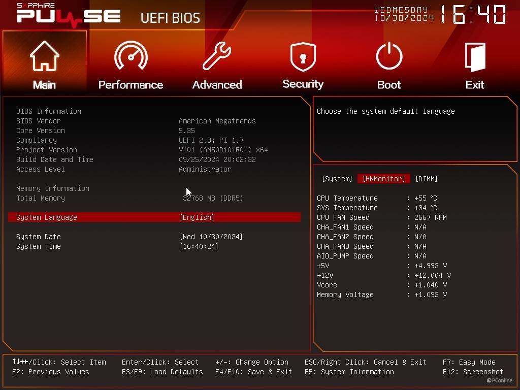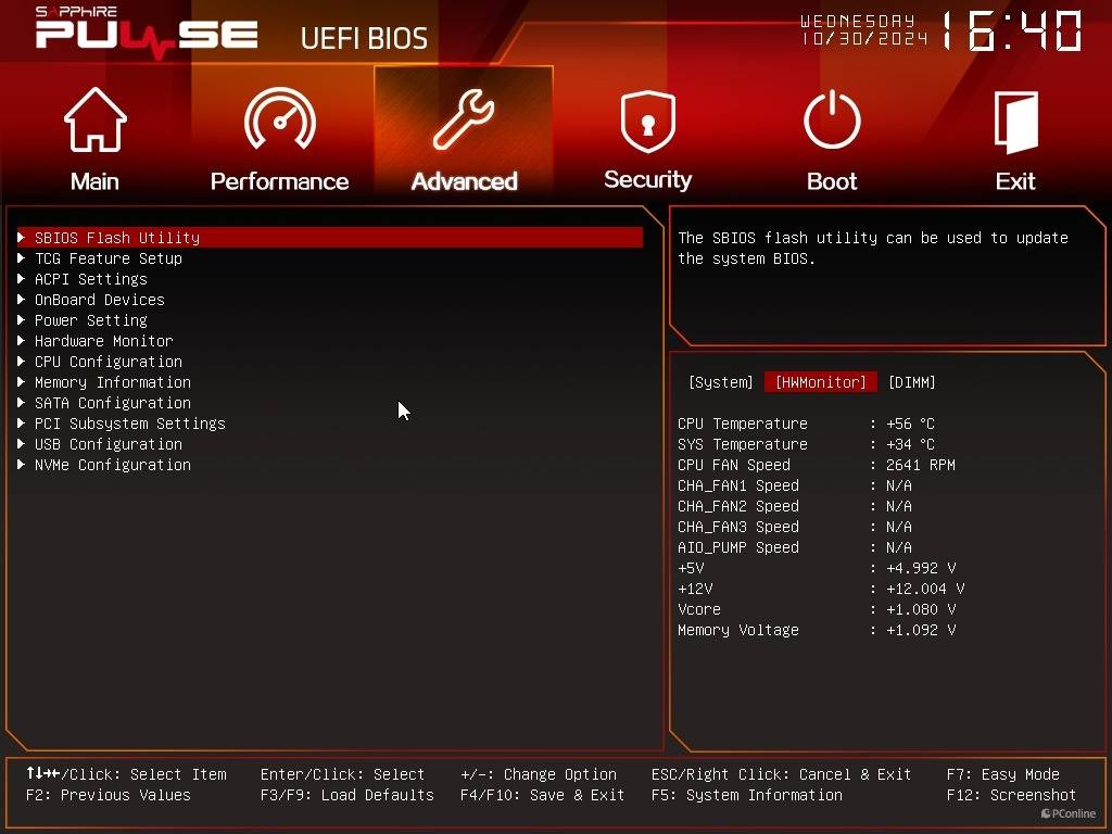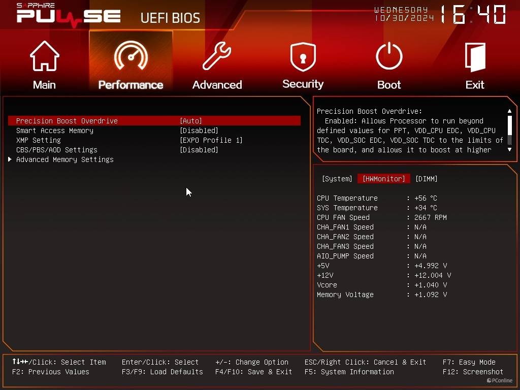 硬件规格想必大家都已经见识完毕了,衡量一款主板的优劣,不仅要看硬件,更要看软件。我们体验了一下蓝宝石 Pulse 脉动 B650M WIFI主板的BIOS操作,一打开就极具PULSE系列的风格,鲜明的橙红配色像极了心跳线。另外相比之前,如今的BIOS设计更加简洁明了,普通模式下就能对EXPO、PBO等常用功能进行调整,对小白玩家十分友好。
