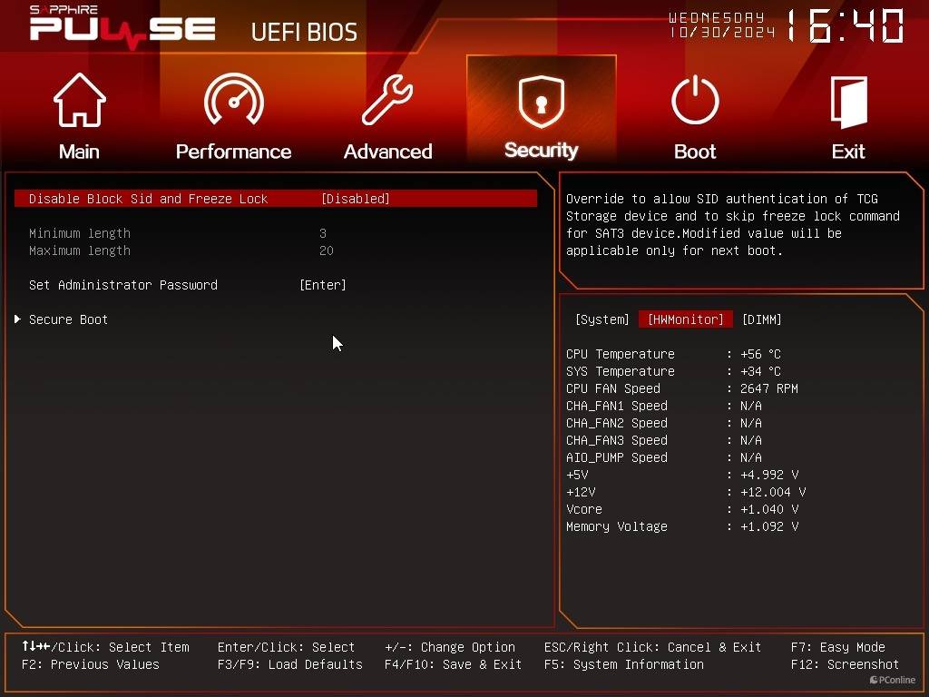 BIOS的下一个页面为安全菜单,顾名思义这个页面就是专为各种数据安全而设,其中可以进行加密设置,保障你的硬件安全。