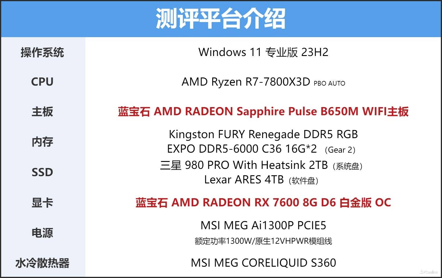 既然软硬件我们都介绍完了,就该开始正式测试前的准备工作了,照例介绍一下测试平台配置。为了验证蓝宝石 Pulse 脉动 B650M WIFI主板的极限性能,CPU我们选用的是有游戏神U之称的AMD Ryzen R7-7800X3D,并且开启BIOS中的PBO功能。