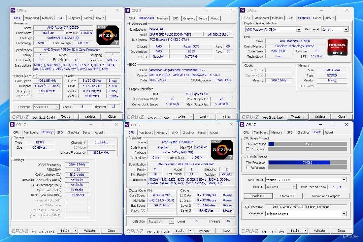 上机先开CPU-Z对硬件进行验证,可以看到此次使用的硬件与上面介绍的相符。此时R7-7800X3D的单核得分为675.9,多核为7102.3,不得不说这个成绩还是相当不错的,已经能够接近一些X670平台的表现了,看来7+2+1相供电带R7-7800X3D丝毫不输。