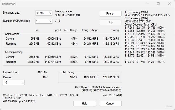 再看看7-ZIP的压缩与解压缩测试,这项测试对处理器的压力一样很大。实测这套平台的测试成绩,压缩为116.816 GIPS、解压为131.745 GIPS,总分为124.281 GIPS,使用率评分为16.35 GIPS,这个成绩在一众B650主板中,那也是佼佼者的存在。