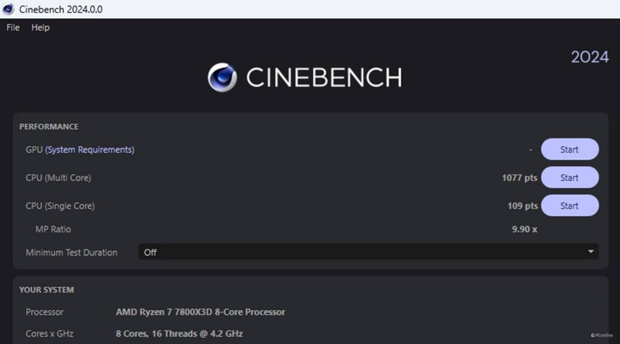 CineBench 2024应该是该系列里压力最大的了,不过R7-7800X3D表现依旧不俗,而蓝宝石 Pulse 脉动 B650M WIFI主板的7+2+1相60A供电也能很好的释放处理器性能,实测单核109 pts,多核1077 pts。