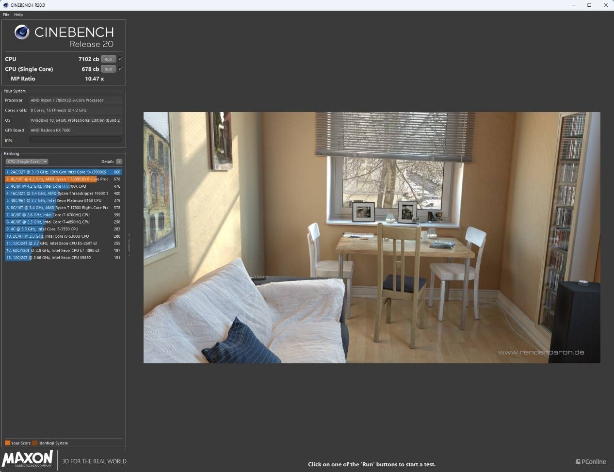 继续上强度,用CineBench进行测试。在CineBench R20中,R7-7800X3D搭配蓝宝石 Pulse 脉动 B650M WIFI主板表现强势,单核得分678 cb,多核得分7102 cb。