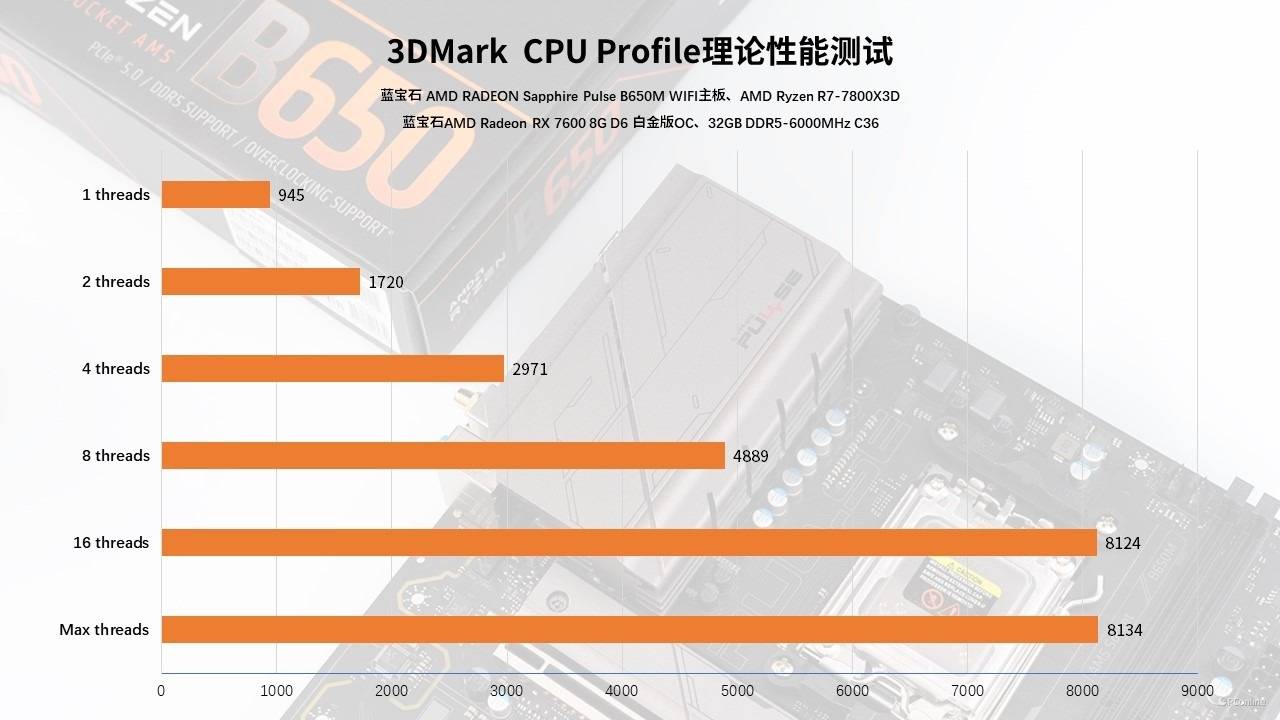 最后是3DMark CPU Profile测试,这项测试可以更精准的测试CPU在单核与多核方面的性能表现,实测7800X3D的单线程分数为945,最大线程分数为8134,表现不错,作为一款专为游戏而生的CPU,这个成绩已经完全能够满足主流用户的需求了。