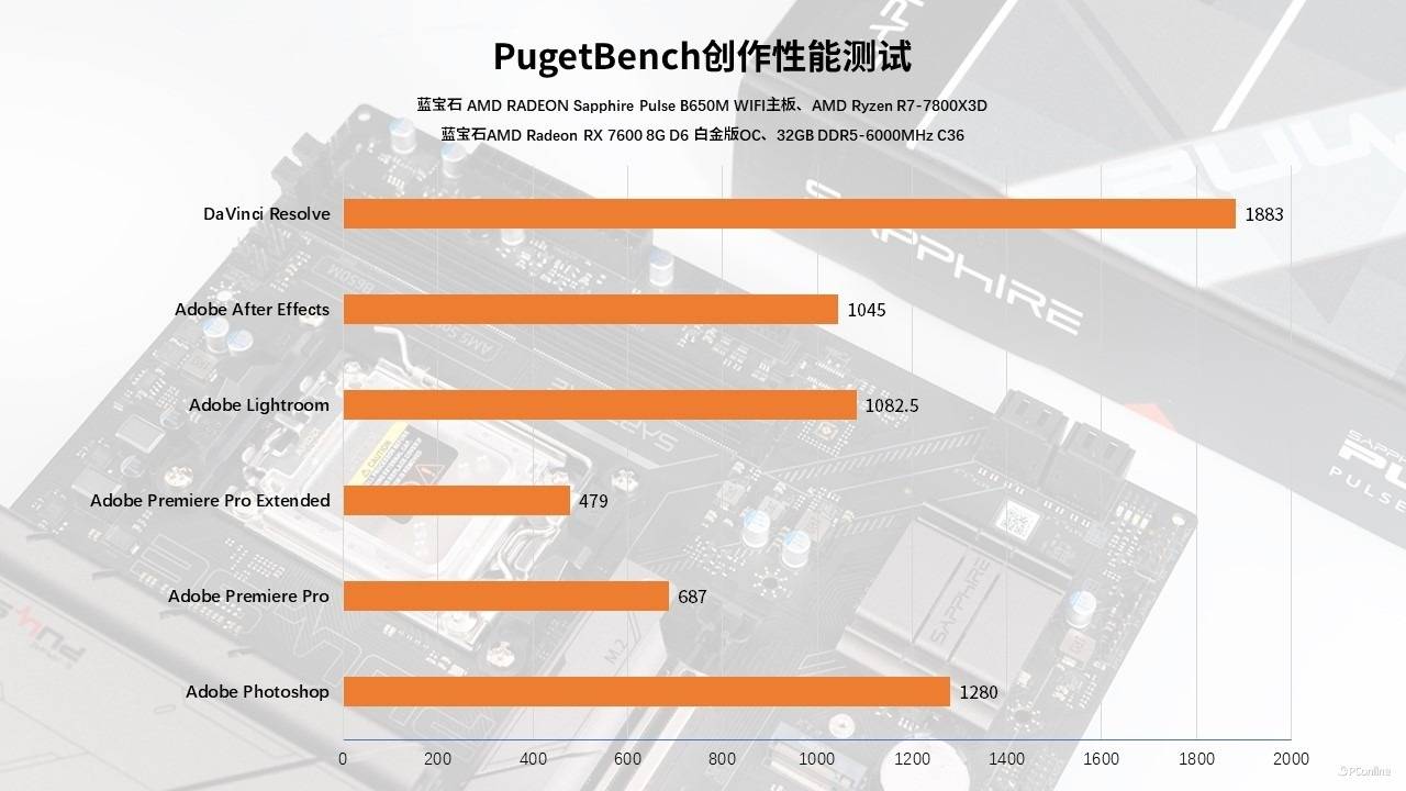 而在性能要求更高的视频处理测试部分,这套平台能够获得PR得分687,达芬奇得分1883,性能释放也不错,证明基于蓝宝石 Pulse 脉动 B650M WIFI主板打造的平台确实有不错的基础,能够让处理器与显卡充分发挥,胜任各种创作生产力需求。