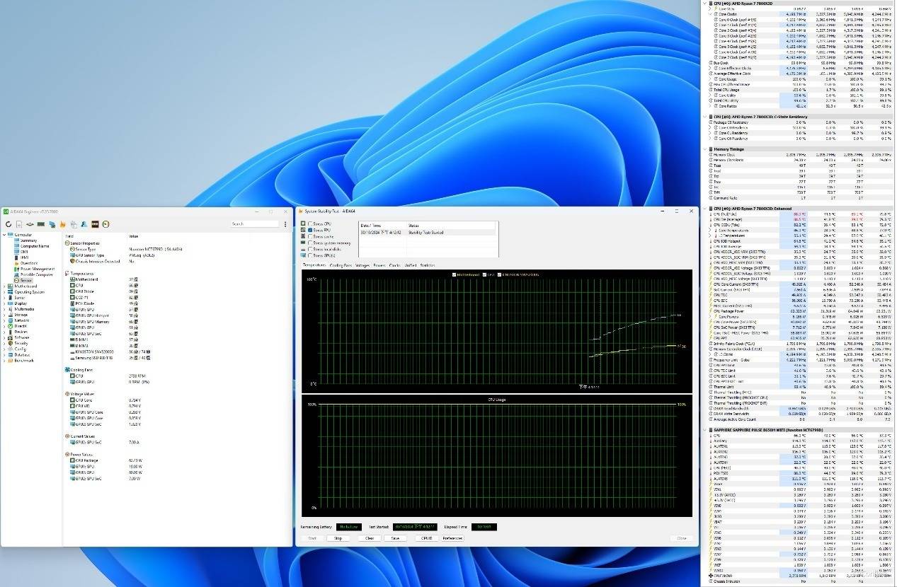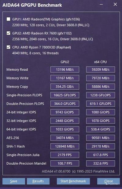 AIDA64 GPGPU测试部分,实测R7-7800X3D的性能释放甚至超越了RX 7600,特别是内存性能、AES-256以及哈希计算方面。你完全无需担心R7-7800X3D被限制发挥,蓝宝石 Pulse 脉动 B650M WIFI主板完全能够让其尽情释放。