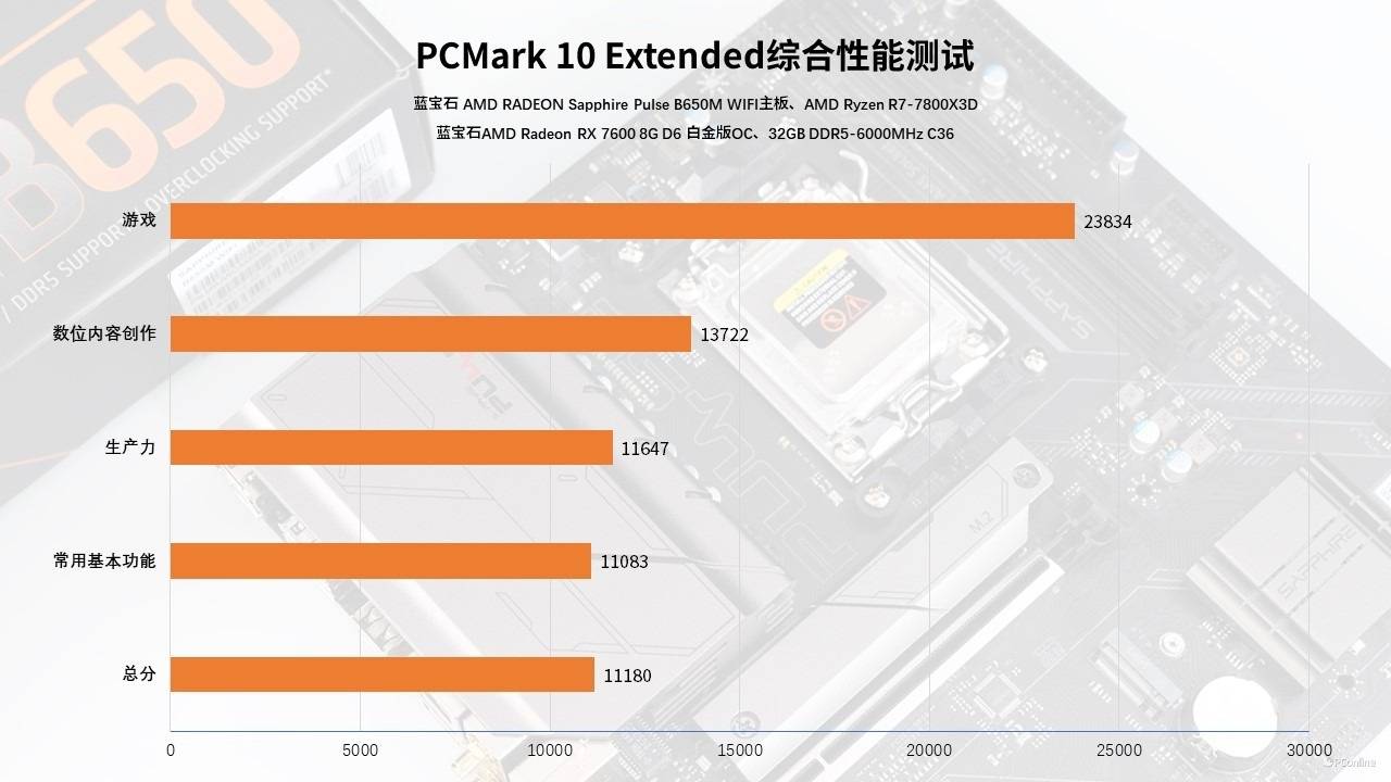 实测这套基于蓝宝石 Pulse 脉动 B650M WIFI主板的测试平台,跑出了总分11180的成绩,其中常用基本功能11083分,生产力11195分,数位内容创作16182分,游戏34535分。由于Zen4全新的架构搭配先进的5nm制程工艺,性能提升巨大,辅以强劲性能的显卡,体验自然不错。
