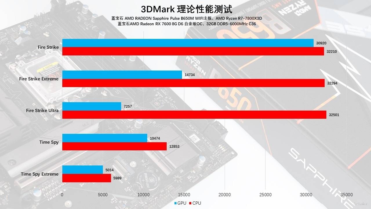 准备进入游戏性能测试,首先我们在3DMark中对这套硬件的理论性能进行了测试,无论是在DX11的Fire Strike项目,还是DX12的Time Spy项目,成绩均相当优秀,特别是在Fire Strike中,R7-7800X3D与蓝宝石RX 7600 8G D6白金版OC的得分双双突破3万分以上。
