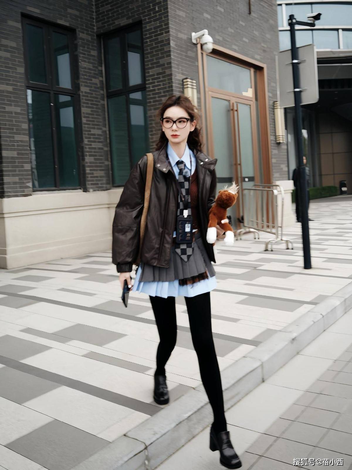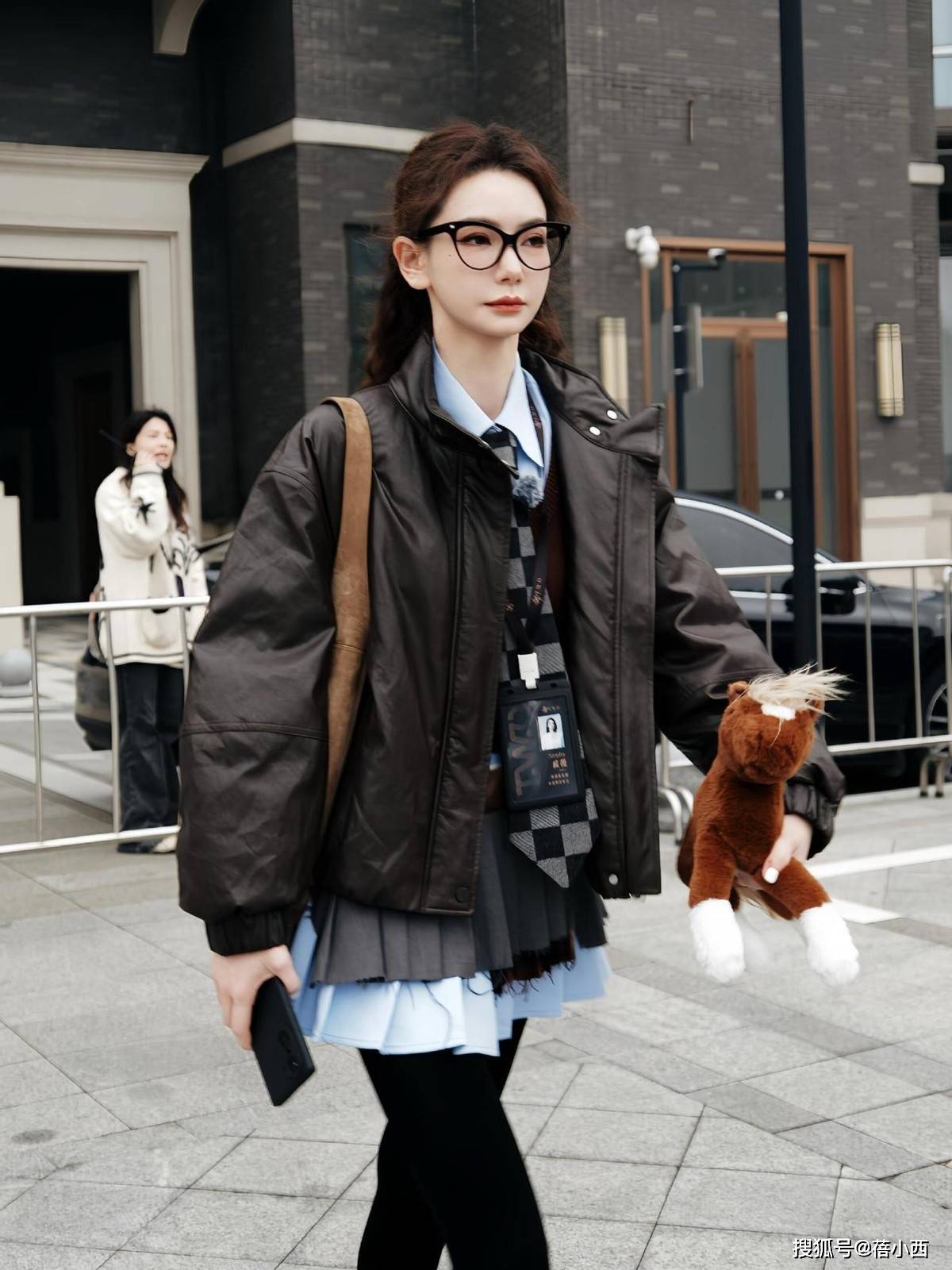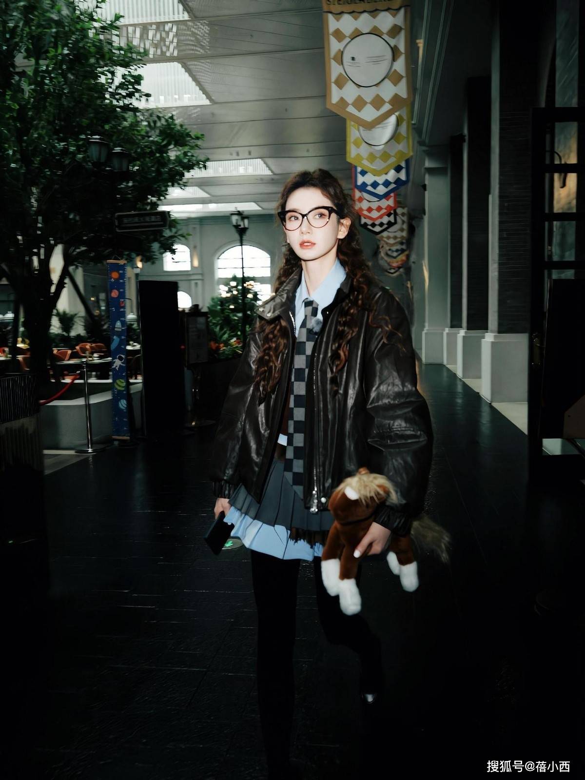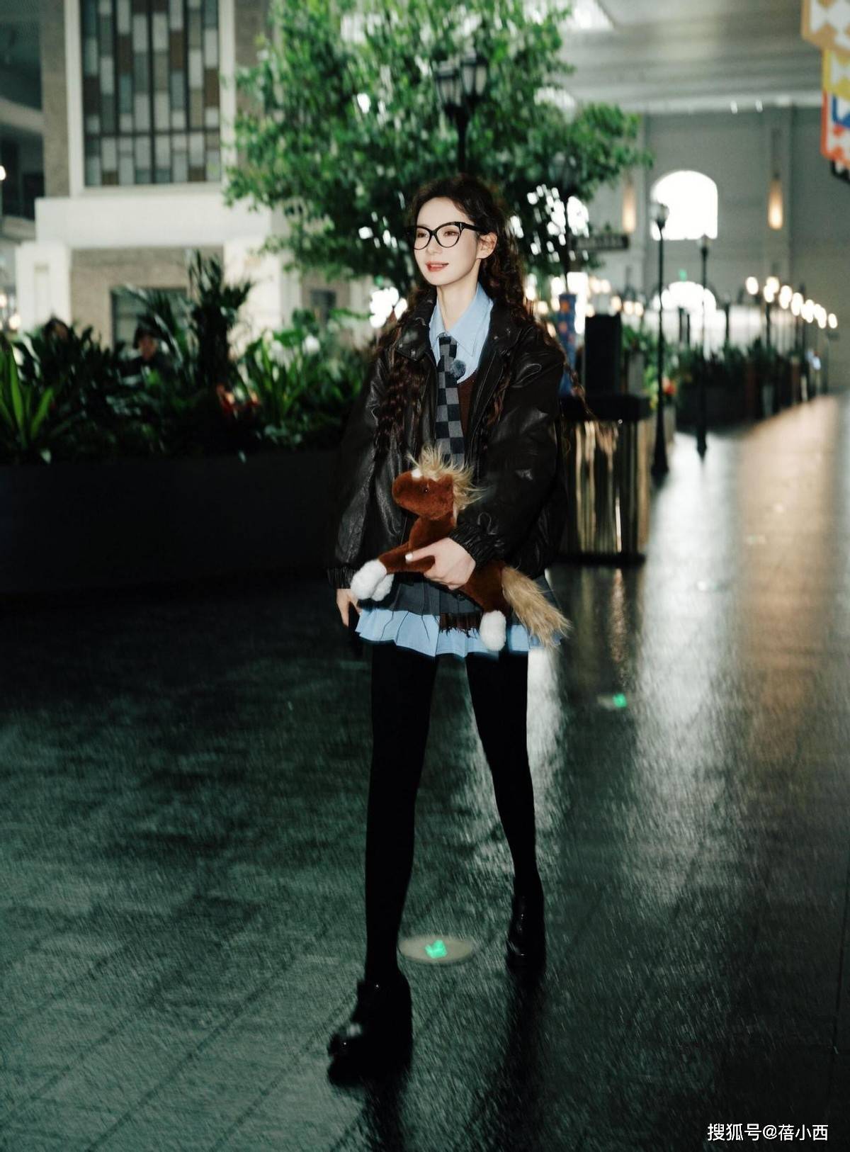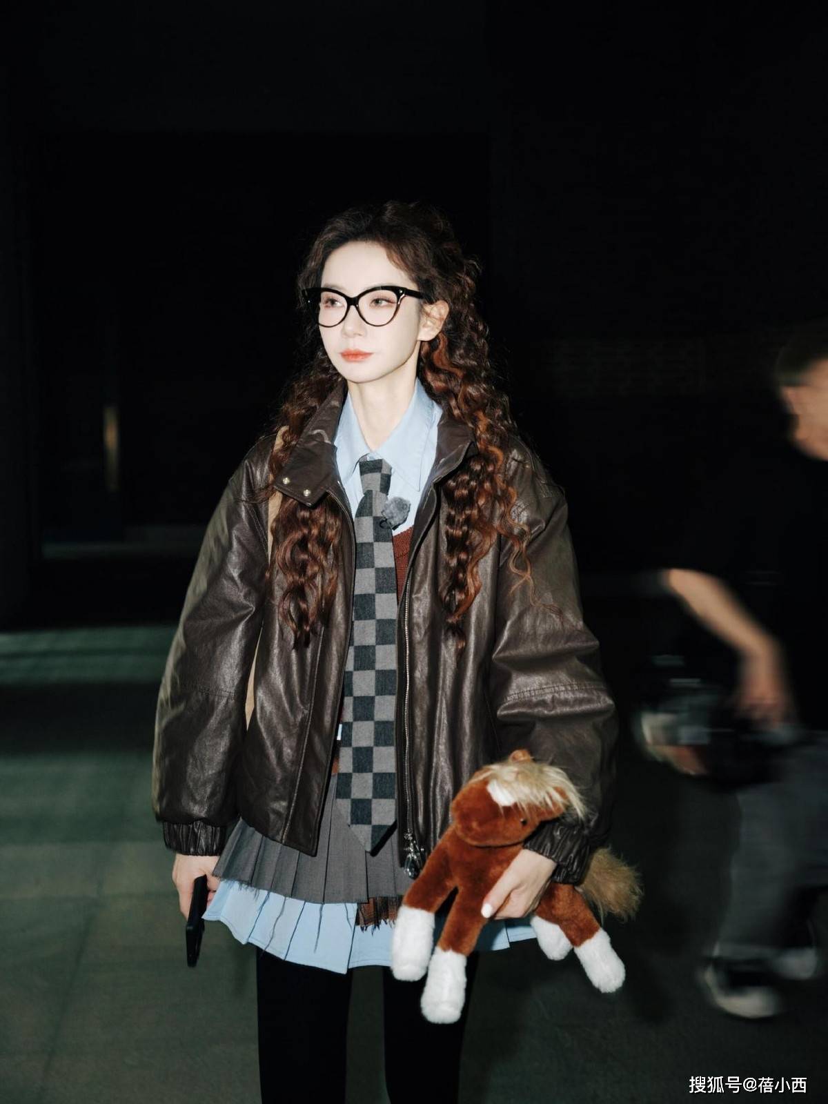 — 戚薇又现“腿精式”穿搭,皮衣+短裙+打底裤好减龄,羊毛卷太洋气 —