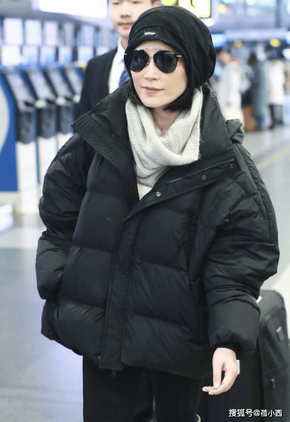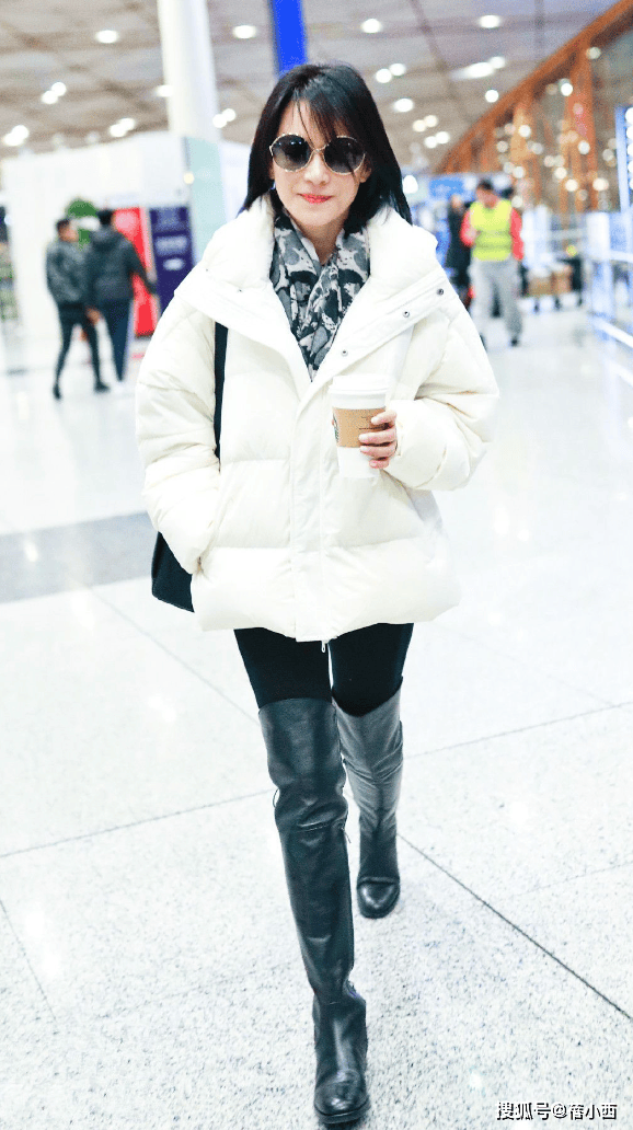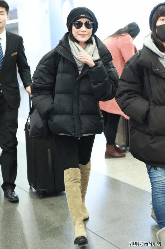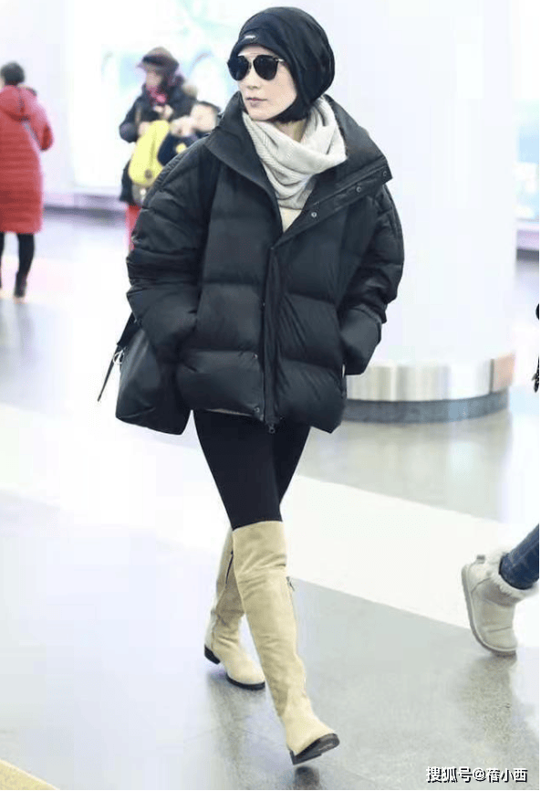 — 俞飞鸿带火了上松下紧穿搭,羽绒服配长筒靴,用围巾+帽子来提亮 —