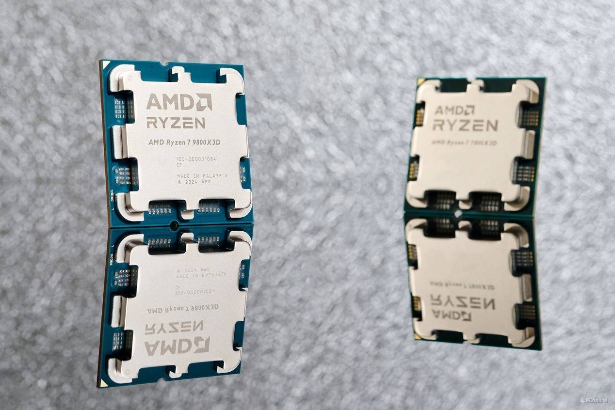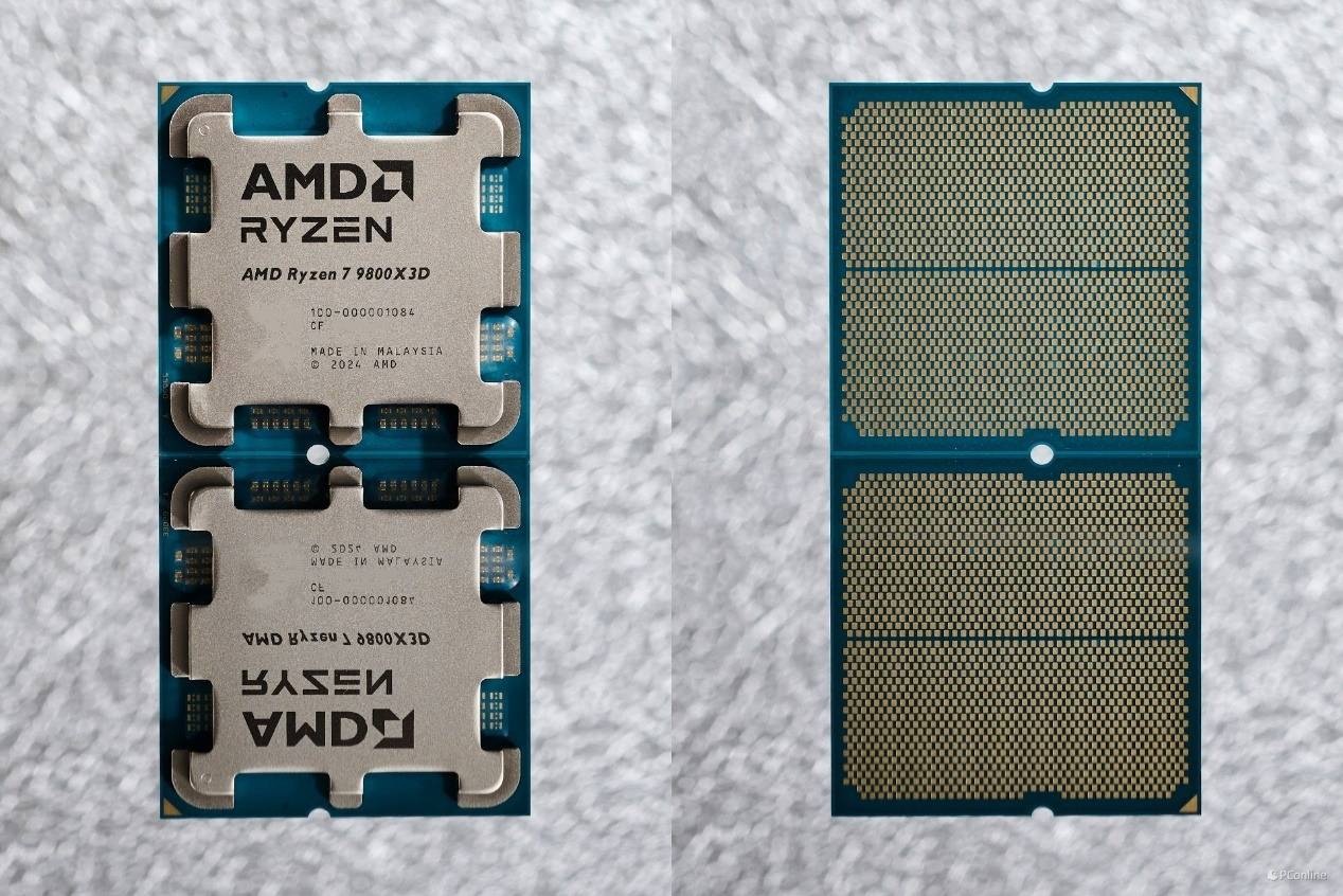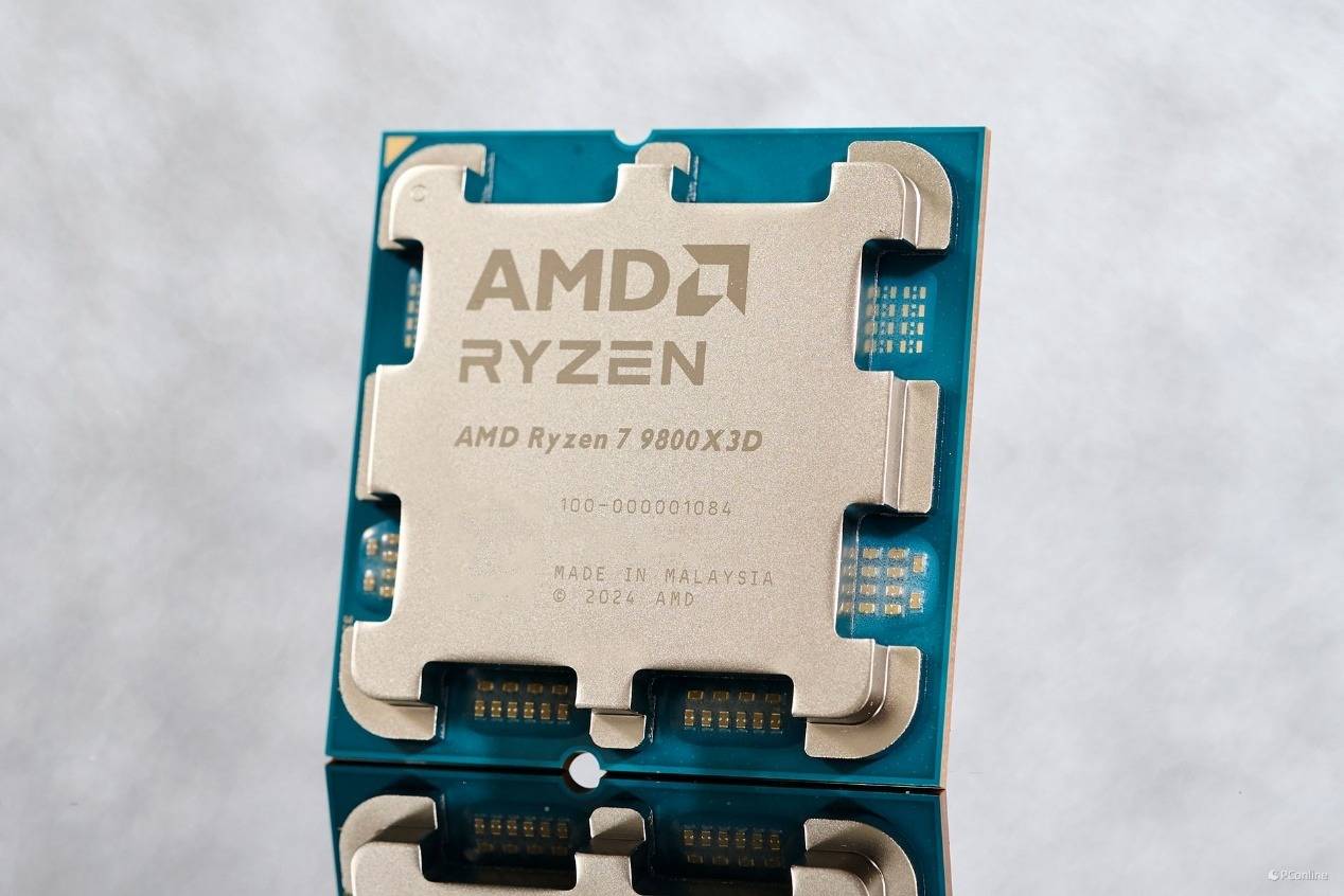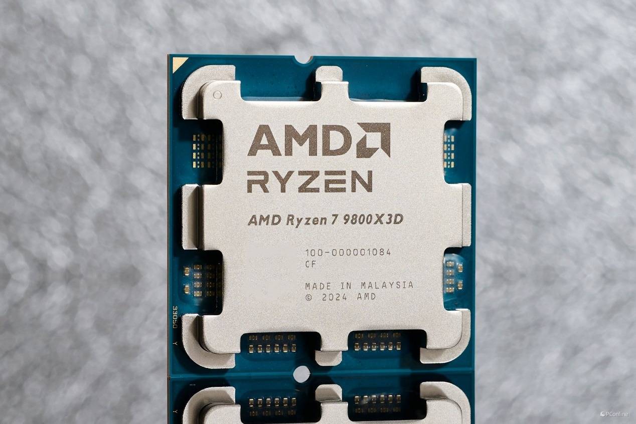规格介绍完毕,看看它的颜值如何。正面外观,锐龙9800X3D与上一代锐龙7000系基本无异,顶盖上丝印了型号“AMD Ryzen 7 9800X3D”,另外我们还可以看到这款处理器的产地,为马来西亚生产。目前综合网上来看的信息,包装将会延续9000系列的设计,并且不再附送散热器。