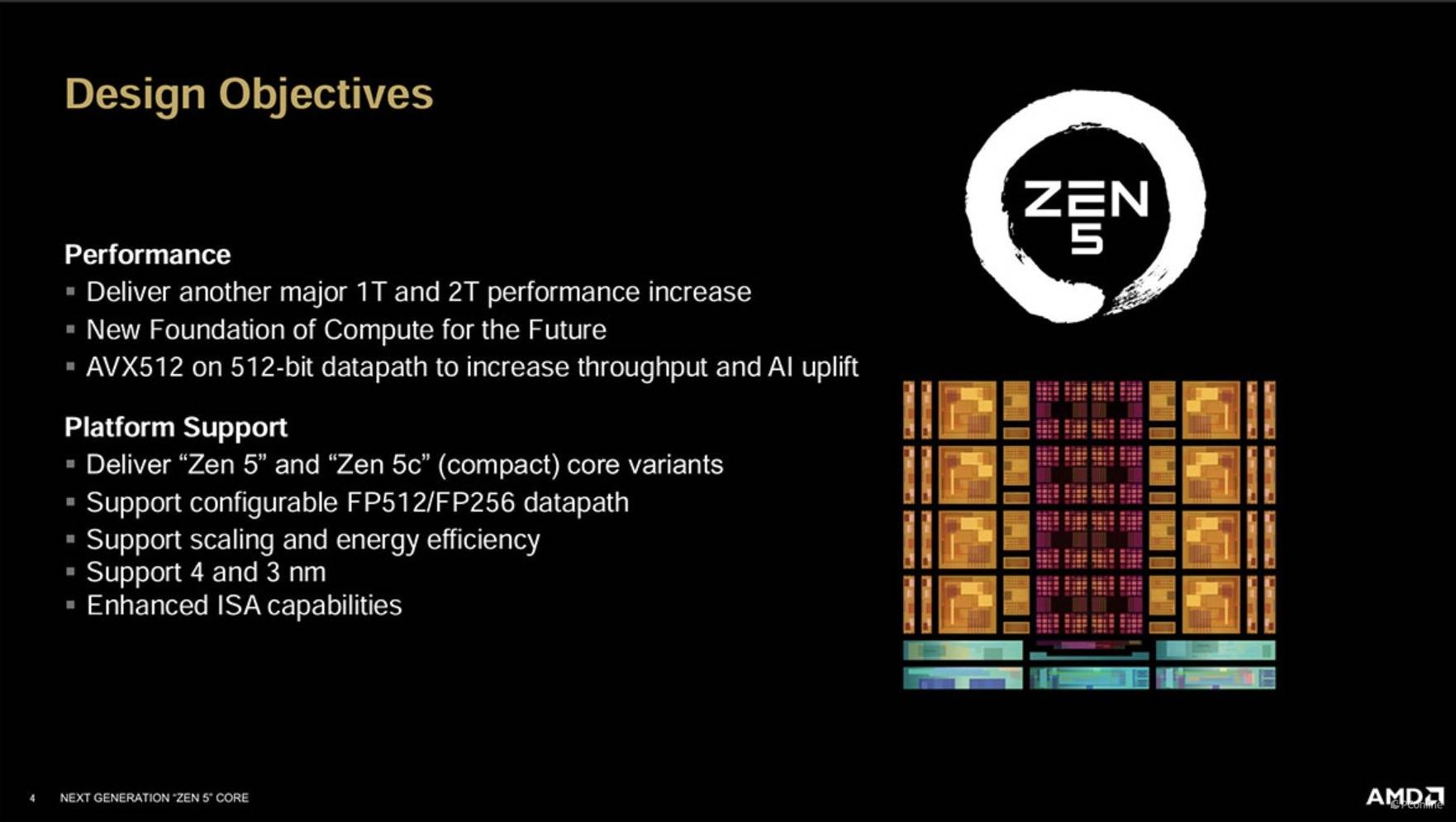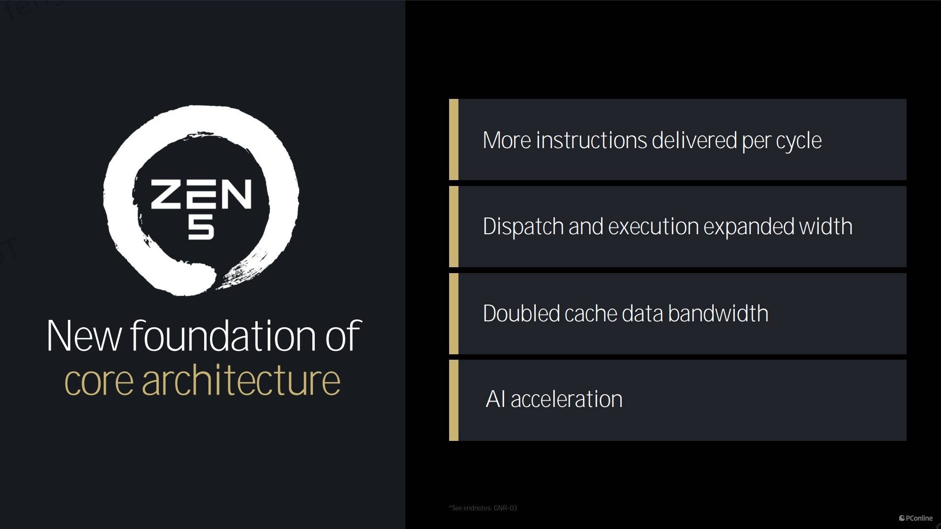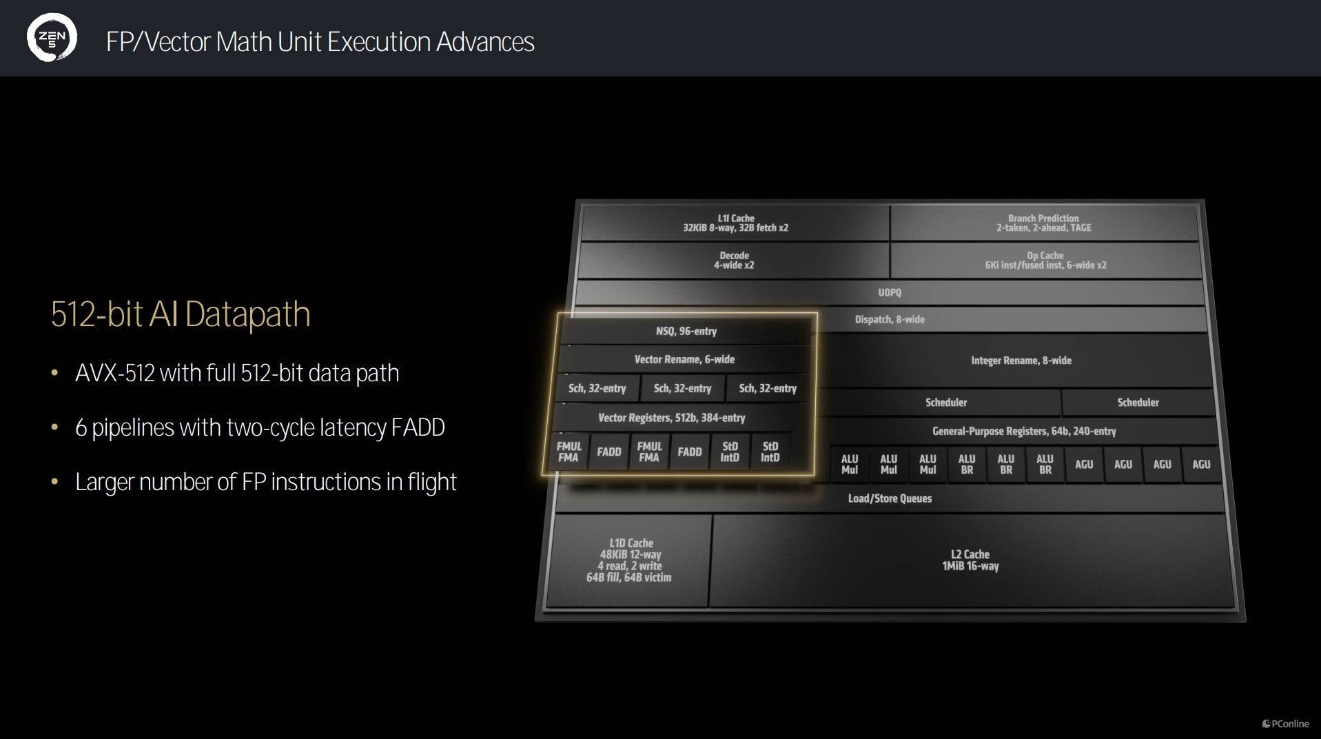 Zen 5架构旨在提升新处理器单线程和双线程的性能,为未来计算核心架构奠定新的基础,同时还为AVX512运算提供完整的512位数据位宽以提升吞吐量并提高AI运算性能。