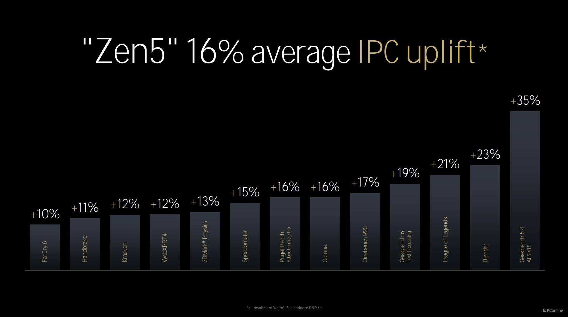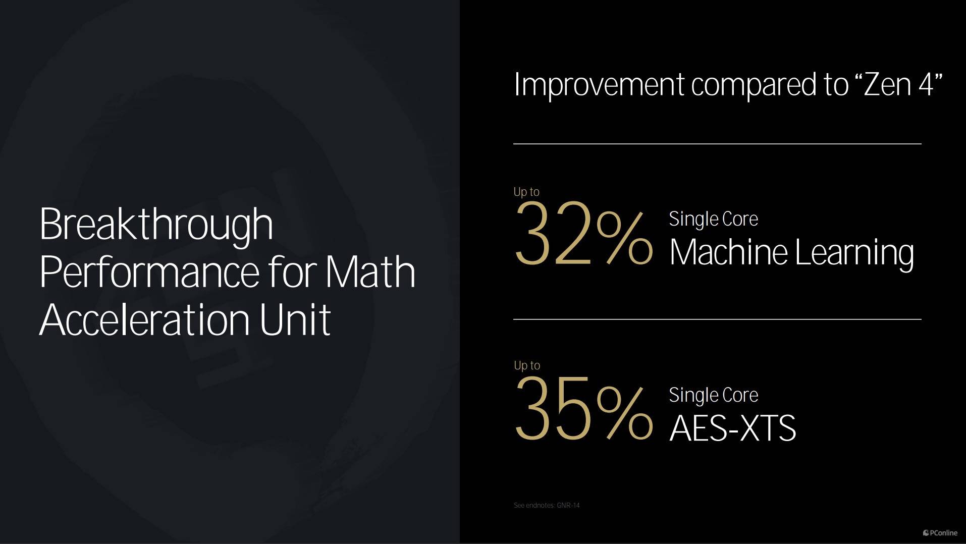 除了架构的大幅改进外,Zen 5相比于Zen 4的IPC性能平均提高了约16%,数据相当可观。加速单元的数学性能相比Zen 4的提升更大,单核在机器学习方面,提升高达32%;针对AES-XTS 加密算法,性能提升更是涨幅35%。