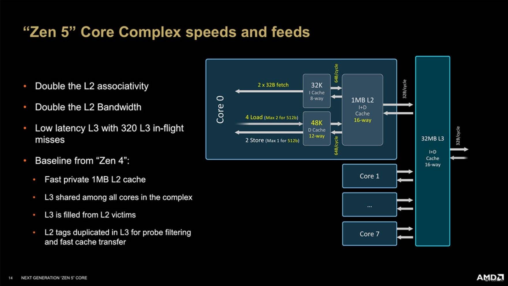 再看看Zen 5 CCX的缓存结构图,可以看到其实它跟Zen 4没有差太多,L2缓存容量依然是1MB,但从8-Way增加到16-Way,这直接让L2缓存带宽翻倍,L3缓存的延迟有所降低。