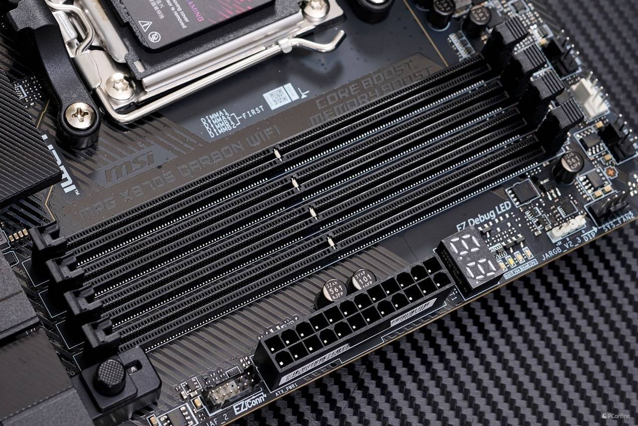 视线回到主板上,微星MSI MPG X870E CARBON WIFI暗黑主板搭载了四条双通道DDR5内存插槽,最大支持容量为256GB,支持EXPO和XMP标准,最大OC标称频率为8400MHz。并且主板BIOS内还有众多微星Memory Boost技术,可将内存的性能实现跨越式提升。