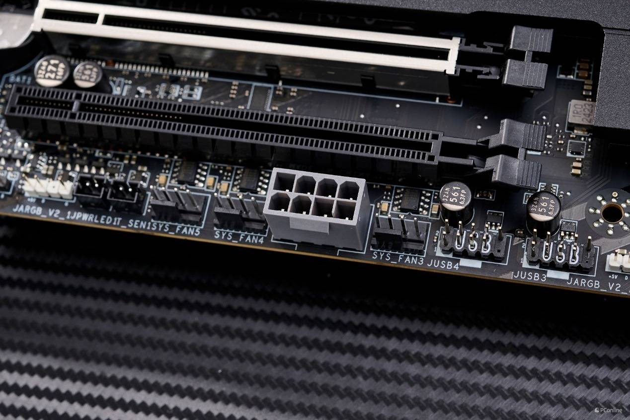 值得一提的,微星MSI MPG X870E CARBON WIFI暗黑主板的底部其实还有一个PCIe 8Pin辅助供电接口,据悉是为了满足未来显卡的需求所设计。