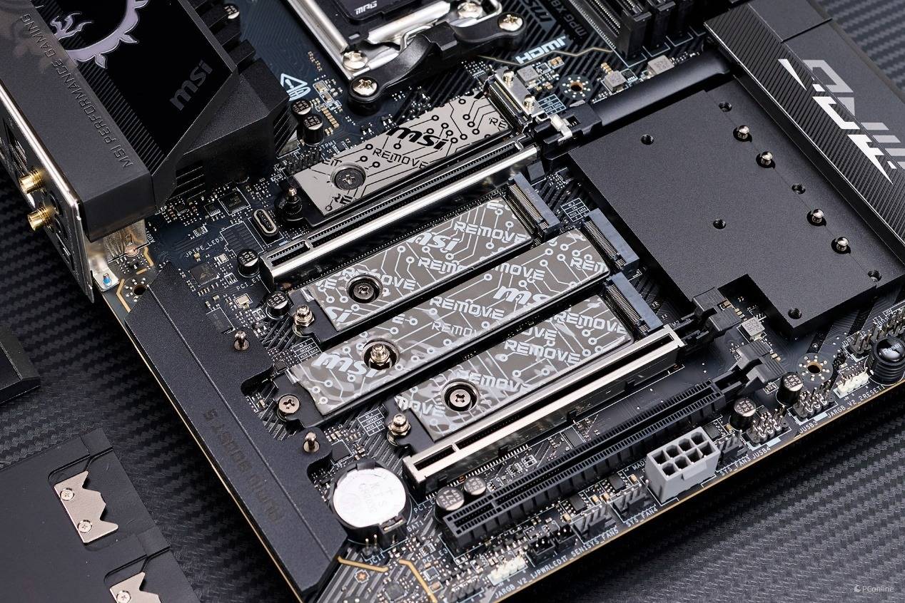 其他发热量大的区域也同样用冰霜铠甲覆盖,像PCIe 5.0固态硬盘处、M.2固态硬盘插槽以及PCH南桥等。每一块散热装甲都非常厚实,拿在手里沉甸甸的。