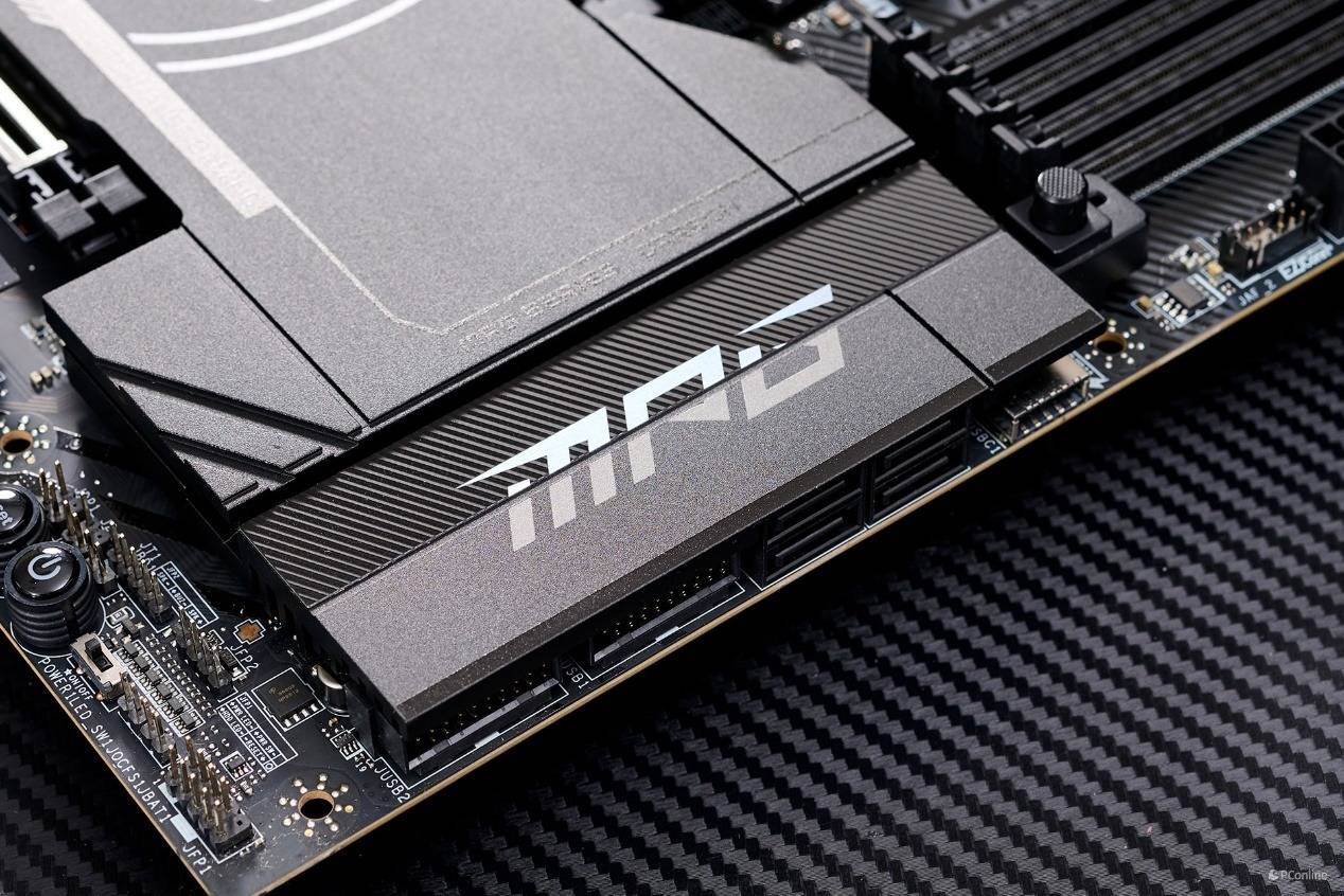 供电规模足够豪华,散热也要跟上。微星在供电模组处安排了完整的VRM冰霜铠甲,采用了纯金属设计,还用复合热管以及7W/mk高效能导热贴,覆盖了整个Mos管与电感,进一步保证性能稳定释放。